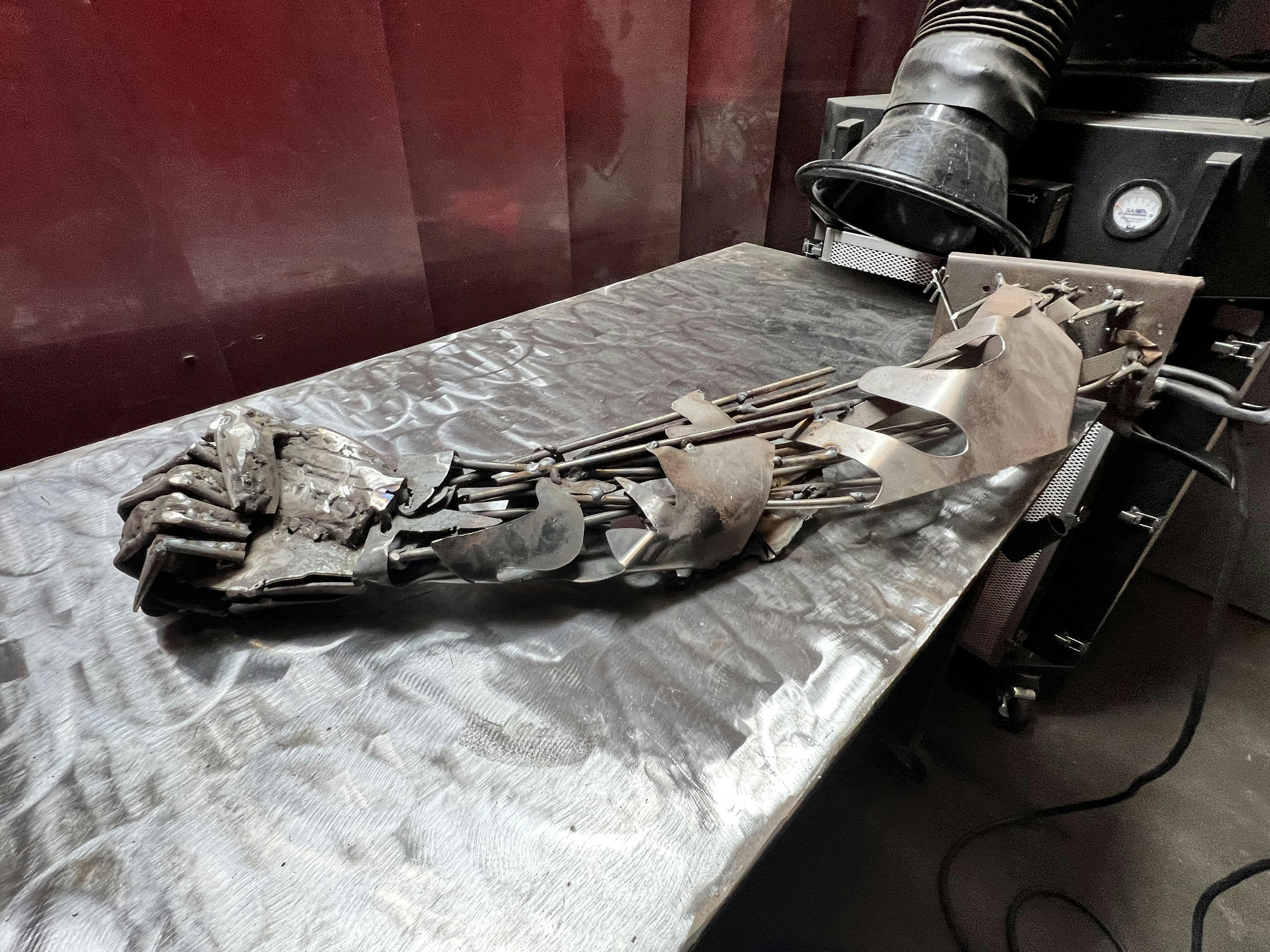 Brooks has a facile way with hard media. He wields a torch like other artists might utilize a pen or a brush and slowly but surely forms come to life. On a table in his studio, a pair of legs emerge from a collection of steel plates and metal spindles.