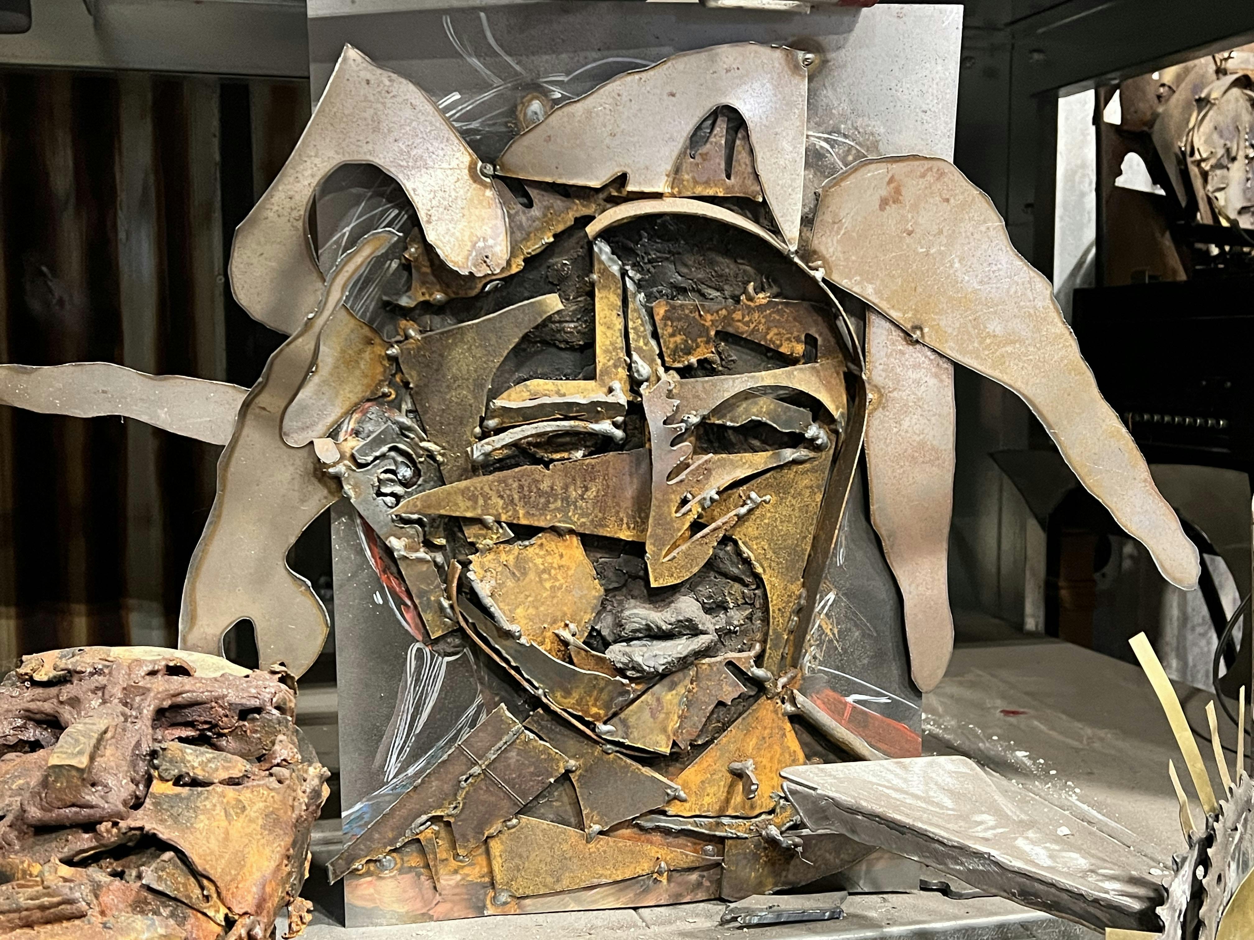 Brooks was trained as a painter, and his artwork does not just utilize metal. Asked about the interplay between works in two and three dimensions, he says, “Originally, I studied painting at art school, so the bulk of my training and experience was primarily 2D focused. Once I transitioned from undergrad, I began to explore different mediums which was when I first discovered welding at MakerspaceCT. So with that said, I tend to approach my 3D work the same way as I approach a painting or a drawing. With my 2D work, it’s very fast and loose; stream-of-consciousness fluid motions. And with welded sculpture, it’s the same principles; assembling things together, cutting things apart, sometimes swift and fast motions and other times going back and adding the finer details. It’s all intuitive. It’s like I’m sketching with metal.”