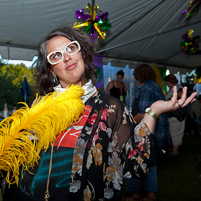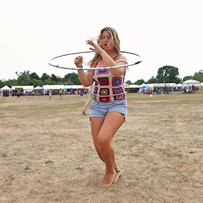 A woman practices her hula hoop skills while the bands play on.