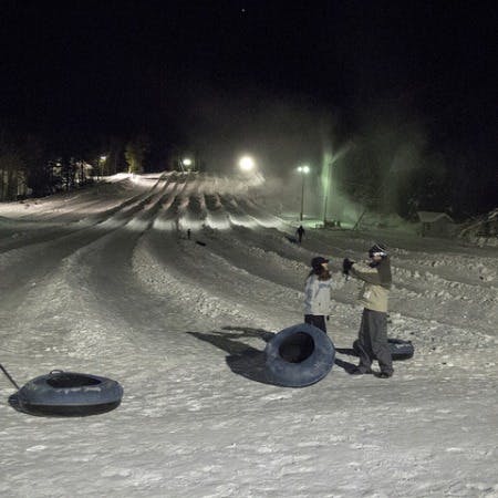 One of the best values for tubing in Massachusetts is to be had at Bousequet Mountain in Pittsfield, located in the cultural district of the Berkshires. There are plenty of open tubing lanes and chutes for people over 5 years old—and the price is only $15 for 2 hours on the mountain.