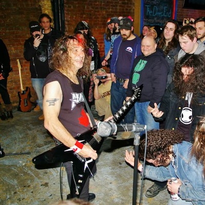 Anvil frontman Steve "Lips" Kudlow performs in front of an excited crowd of metalheads at Providence's Dive Bar. Photo: Lisa GourleyOn a Monday, what better way to start your week then to see a legendary metal band? An act from our neighbors up north in Canada called Anvil, who you might know from that documentary that bears the same name, came through Dive Bar and ripped everything apart. Back in the 80s they shared the stage with the likes of AC/DC & Metallica and recently they've gained a cult following among metalheads of all shapes & sizes. It was an early show, so I missed most of the openers. My apologies to whoever played before I arrived, but be sure they are worthy of the opportunity. It was a Metallicious Monday at Dive Bar, my brain got shredded into pieces along with everyone else's.