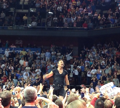 Veteran band mate and lead guitarist Stevie Van Zandt, who re-joined the tour Saturday night, was reminded of that fact early in the show. Having just returned from filming his award winning Norwegian TV show, Lillyhammer, Van Zandt had to catch his breath during an intense version of “Two Hearts.” “You do this every night?” he asked Springsteen. “He’s a little out of shape. Every night you do this? Every fucking night!” answered the Boss in a typically unscripted moment.