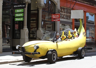 It was the Big Banana Car, and Steve Braithwaite, the owner, builder, and driver of the vehicle, maneuvered his magnificent machine right outside the GoLocalProv office and offered pedestrians, passing cars, and reporters a brief respite from the workday and a fresh start to the weekend.
