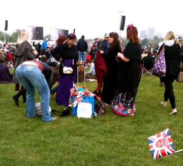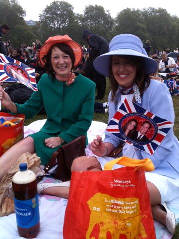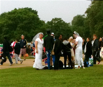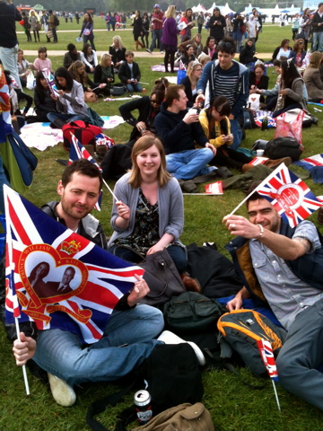 Hyde Park, 8:22am GMT... We have arrived at Hyde Park. It's nearly 3 hours 'til the wedding starts and it's already packed. These people have dressed up, wearing hats etc. Even the men have gotten into the act, as you can see. It is SO exciting! Here are some people who have gone all out! Flags everywhere, enormous screens showing everything! An amazing atmosphere.