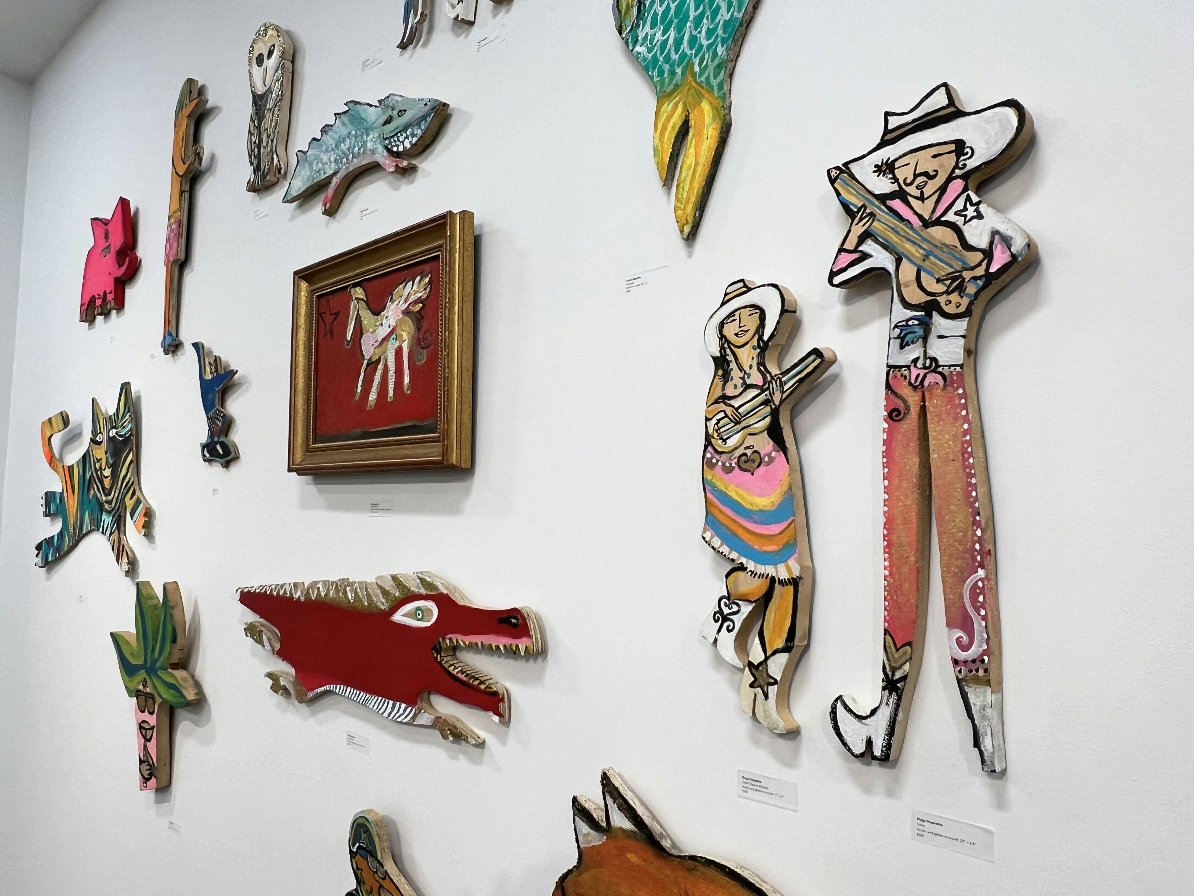 Some of the most striking pieces in the show come from Desjardins, who is exhibiting a wall-spanning collection of moderately sized shaped panels that take on whimsical and colorful forms like animals, musicians, or cars. Desjardins has been active on Block Island for the last 15 years and has exhibited his work at the International Outsider Art Fair in New York as well as at the New Mexico Folk Art Museum.
