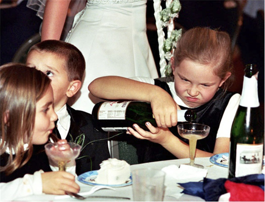 In my humble opinion, children under 21 do not belong at grownup parties where alcohol is being served. Even children who are part of the bridal party, such as ring bearers and flower girls, after attending the ceremony and photo shoot should be taken home. An exception would be a big family wedding where activities have been organized and caregivers are on hand to supervise. For insurance/liability reasons, country clubs have become careful (with good reason) about not allowing children into areas of the club where alcohol is served. Signs at the bars say, No Children in