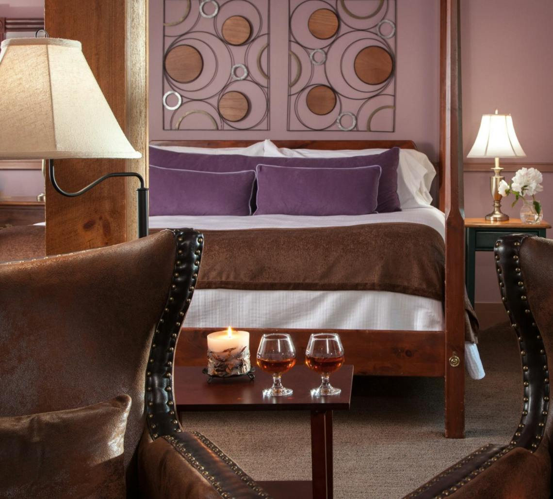 This log cabin B&B has all the amenities to relax and cozy up with your partner and enjoy a glass of wine together, like in-room Jacuzzis and floor-to-ceiling fireplaces. If you’re looking for more adventure, Bear Mountain Lodge offers guests discounted lift tickets for Bretton Woods and Cannon Mountain for skiing, plus snow-shoe trails right on-site.