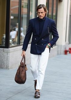 White trousers go best with loafers and not tie shoes, and look even more distinguished with a blazer — even without a necktie.