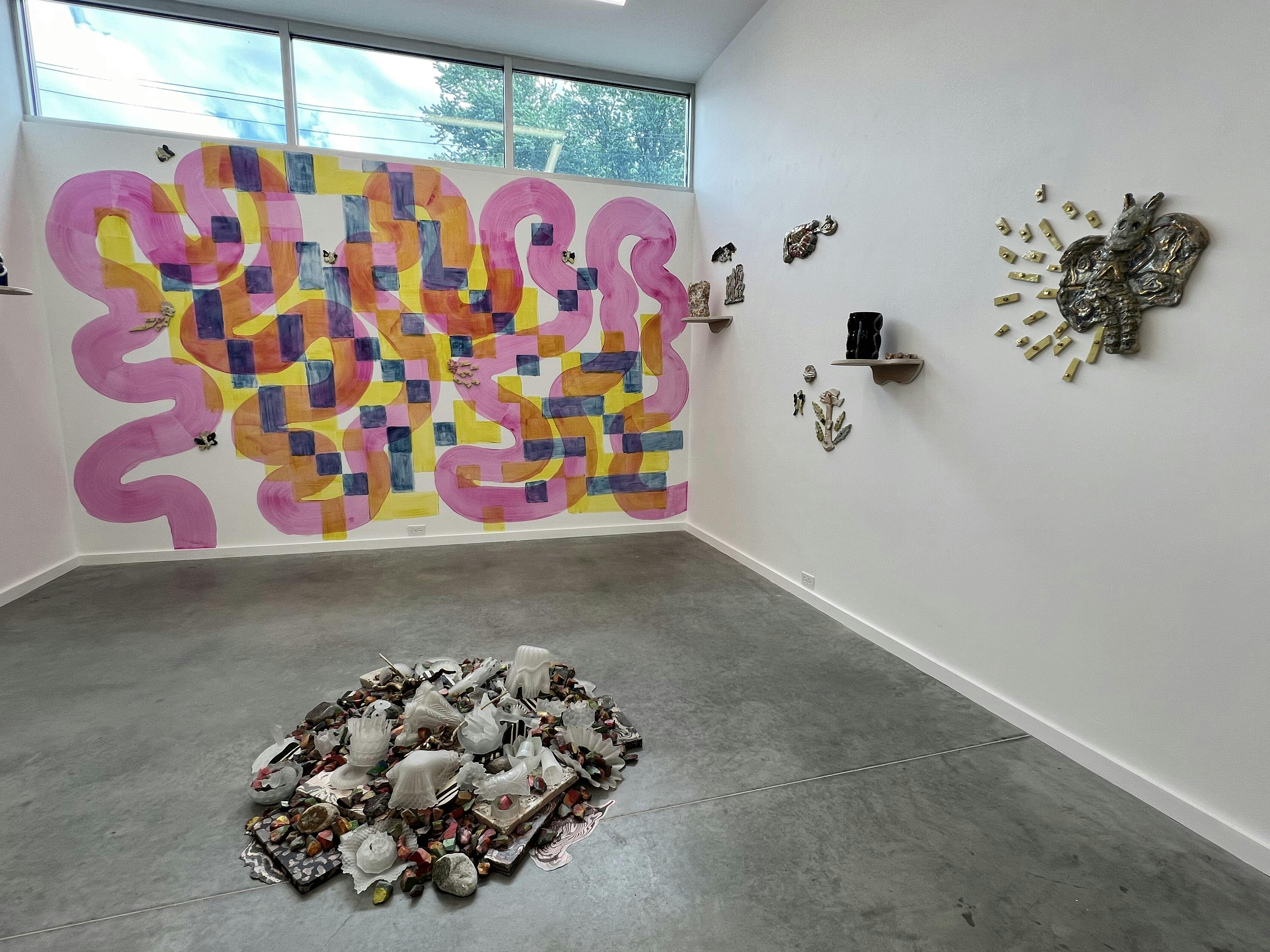 On view from June 19 - July 27, the exhibition, titled Same Rain Same Stars, is a collaborative installation that joins work by Schiffman alongside work by his wife Athena Witscher and their close friend Eamon Brown. Featuring Schiffman’s distinctive slab-based ceramic pieces, many of which were arranged by Witscher, the show includes additional vessels by Witscher as well as a floor installation and wall-mounted work by Brown. The entire assemblage, which is set off by bright wall paintings, is complimentary and exciting. It shows three artists engaging in conversation and reorients traditional expectations about how ceramics are made and seen.