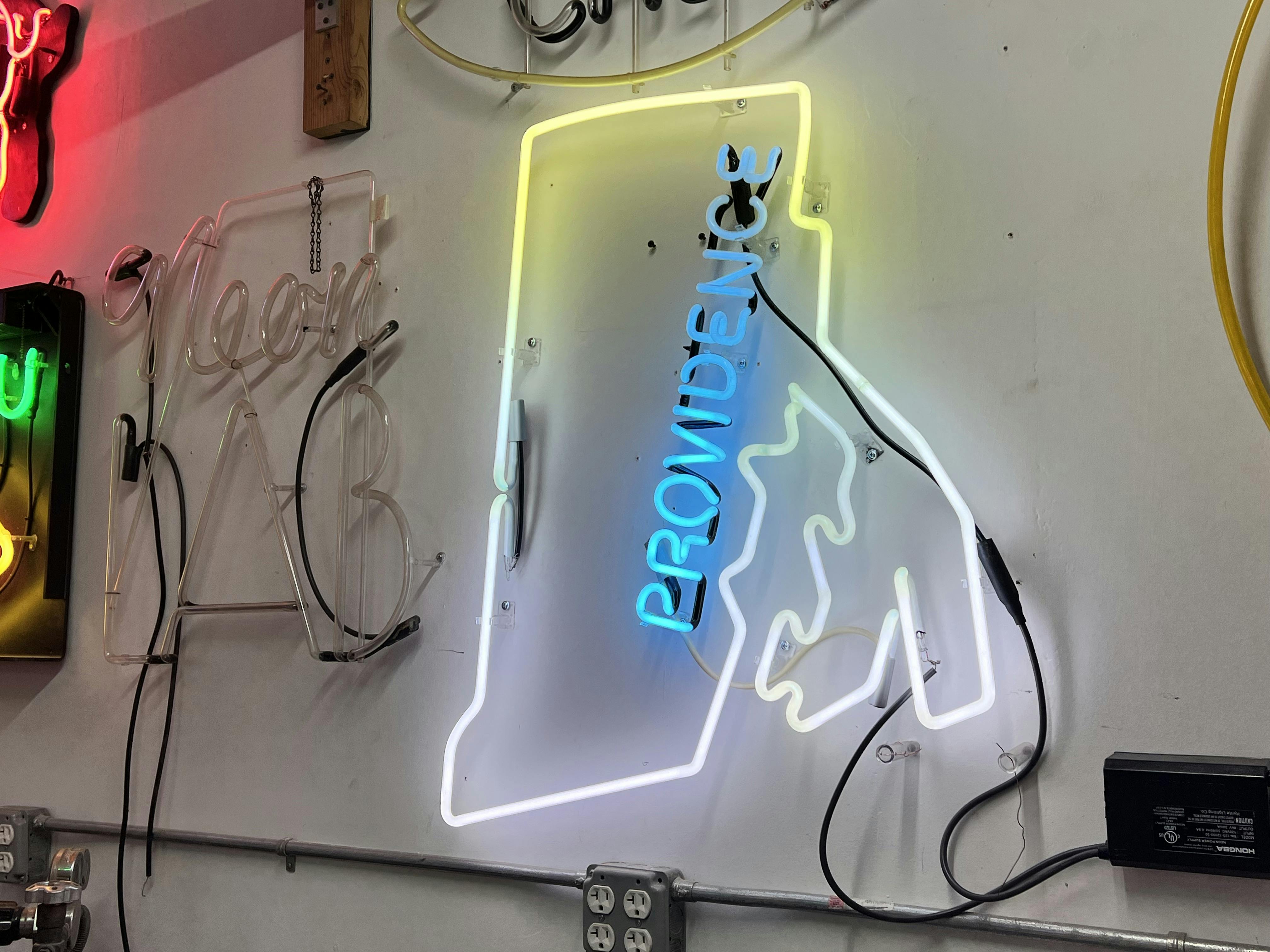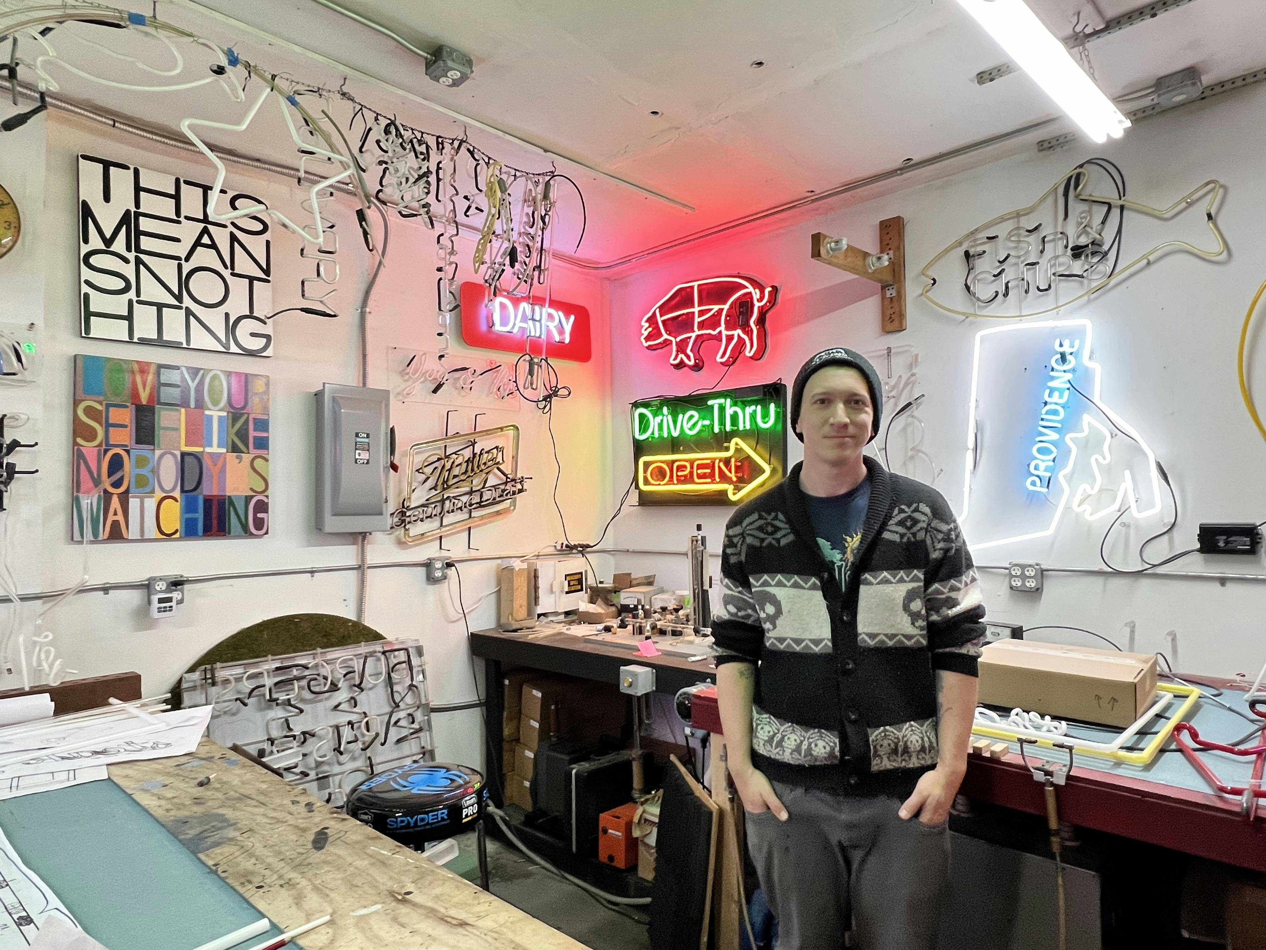 The commercial element of McKnight’s practice underwrites his work as a fine artist. In 2024, his work on the restoration of the Baba’s Original New York System sign on Smith Street earned a Providence Preservation Society Award. He also made the sign for RiffRaff bookstore bar in Providence and has crafted a number of custom commissions for film studios producing movies in Rhode Island. Clients across the country have sought him out for his expertise in creating glowing imagery.