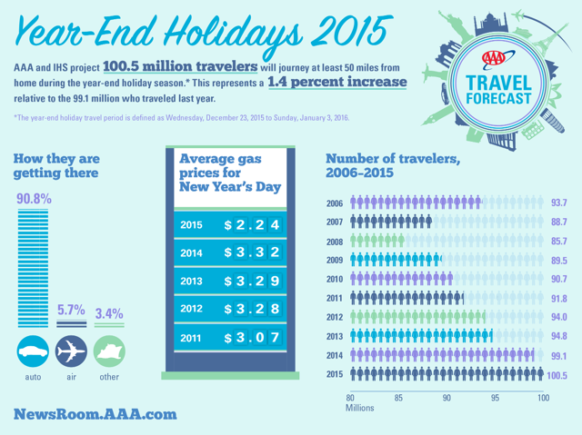 AAA projects that nearly one in three Americans will take a trip this holiday season, with 100.5 million expected to travel 50 miles or further from home. Those numbers represent a 1.4 increase over last year and the seventh consecutive year of year end holiday travel growth.