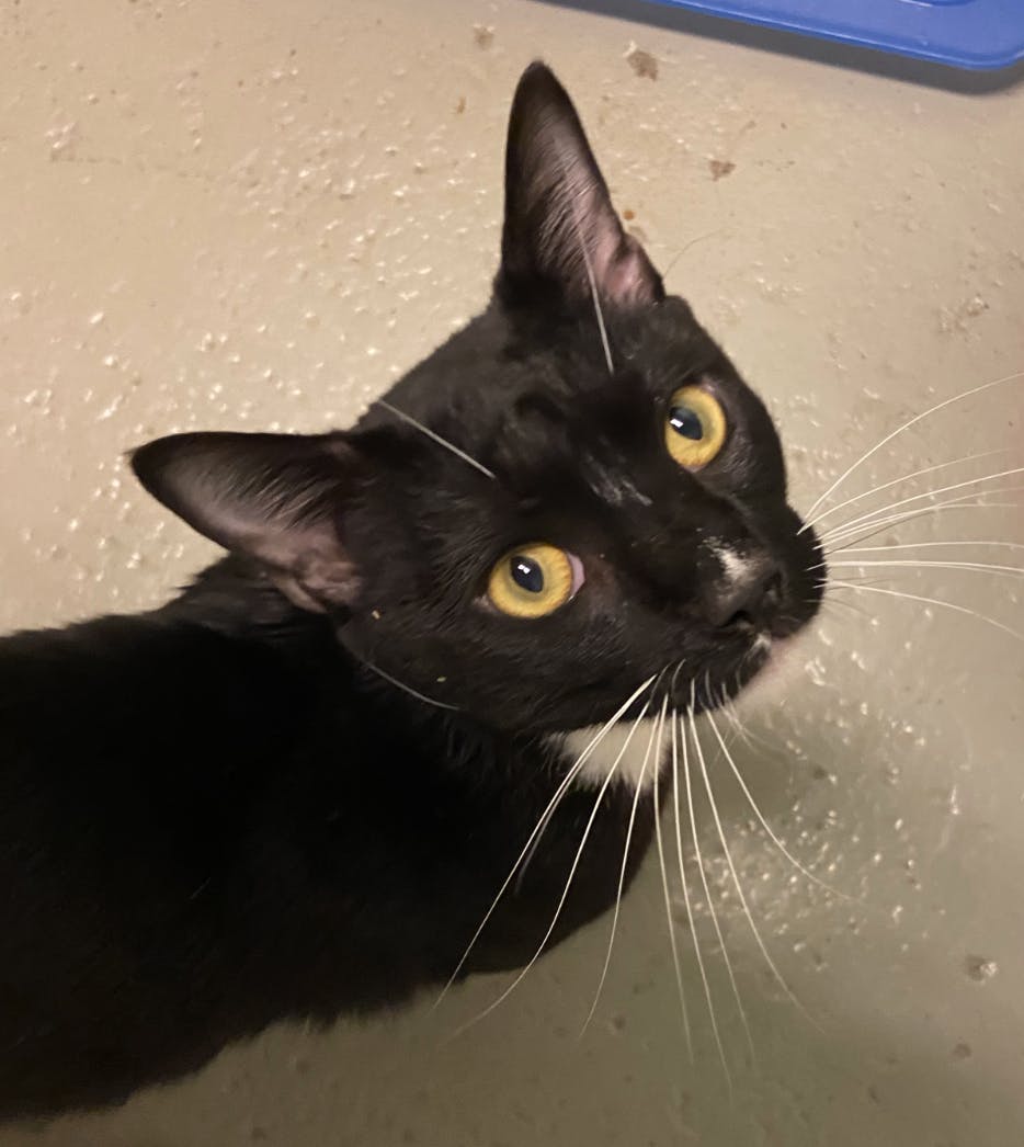I'm Alley Cat! I'm a young male cat found by my PARL friends as a stray. I love to talk to you and need a little work on my manners, but I have a lot of love to give (and pets to accept)! I might be okay in a home with another animal, depending on the cat or dog in question, but I'd do best in a home without children. In terms of my personality, I’m a cat on a mission: PARTY! I love to play and explore and test my limits. I’d love to play with you, but I can make a toy out of anything: pencils, post-it notes, potatoes. If you’re looking for some laughs and someone to liven up the party, think about inviting me.