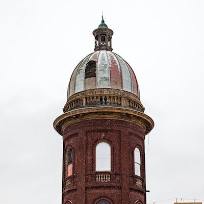 The Atlantic Mills complex historically includes a collection of buildings on Manton Avenue with its original power source, the Woonasquatucket River, running behind it. One of Providence’s most highly visible and visually distinctive mills, it features almost-twin circular-plan stair towers topped with robust balustrades, high ribbed domes, and tall lanterns (one now missing). Otherwise utilitarian in design, a mill typically achieved architectural distinction through the ornamentation of its most prominent feature, the tower on its façade. Although the mill structure is being utilized, the towers are falling into a state of disrepair.