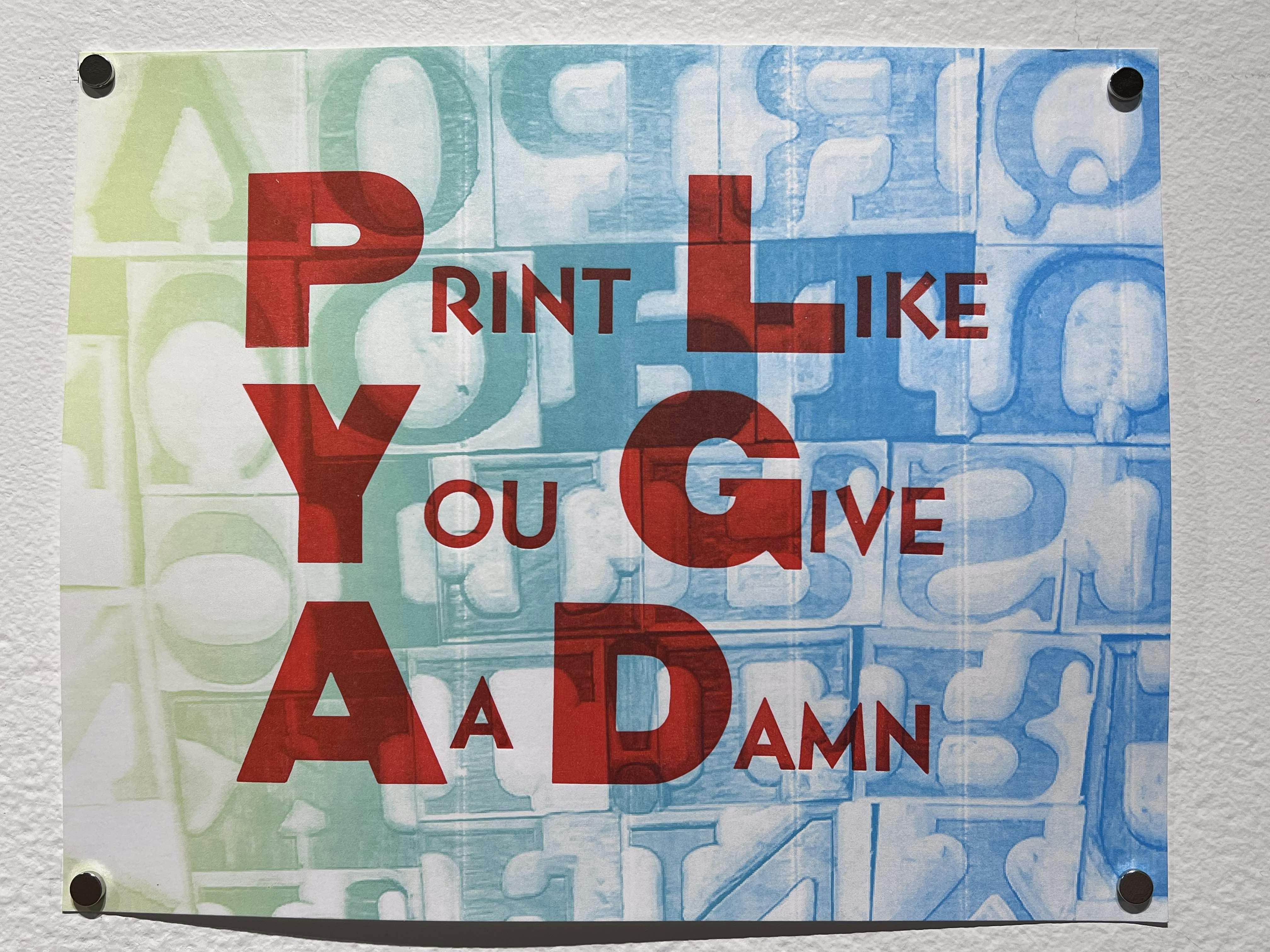 Where Bidon’s works at City Hall are tightly choreographed, his contributions to Providence Prints! show off a wider range of techniques. One image in this grouping is printed on a mirrored surface and asks viewers a direct question which reads, “What do you see?”. In this piece the directness of Bidon’s artform is apparent. Letterpress as a medium is both powerful and fragile. Through his expertise and artistry Bidon is keeping this craft alive while commenting on important subjects.