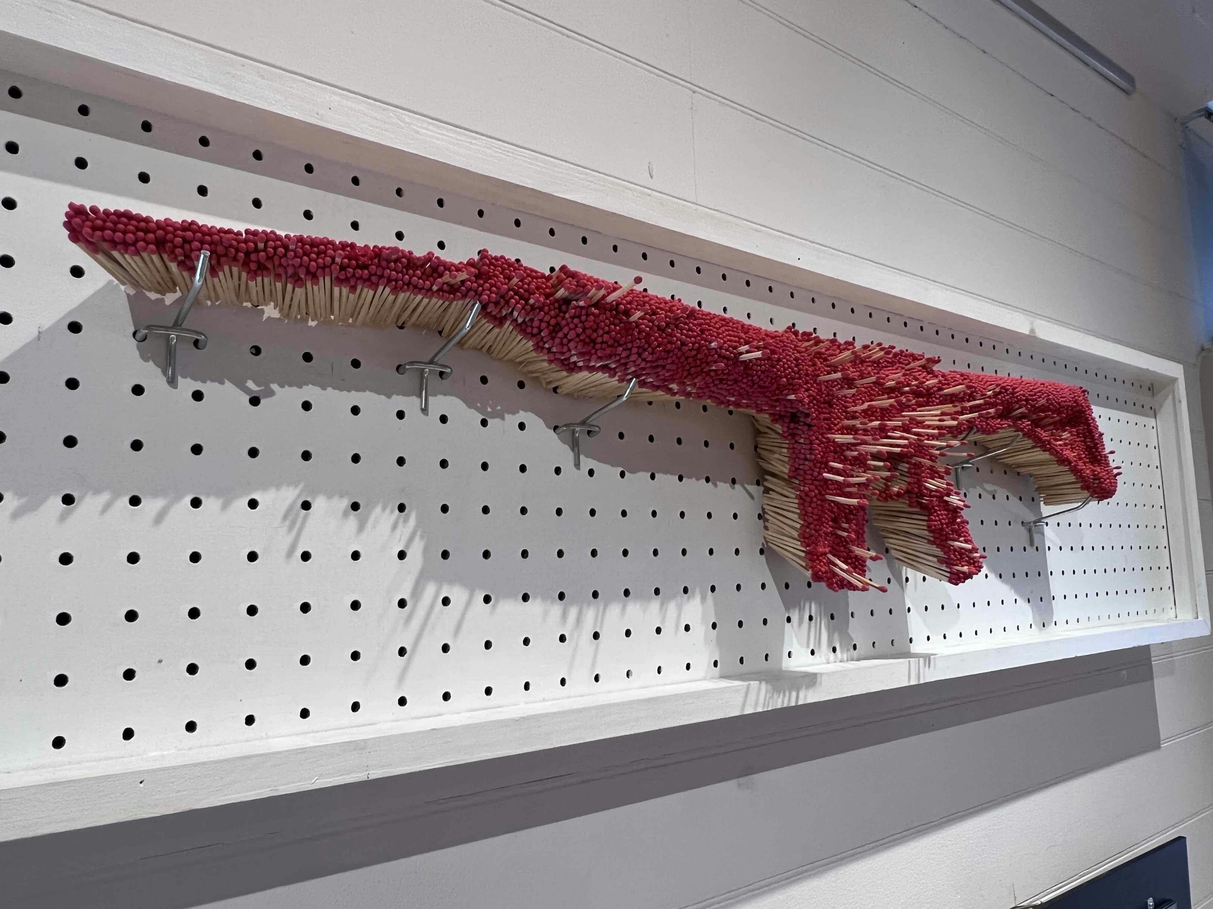 Scott Lapham has contributed several of the most potent pieces in the show, which all probe the crisis of gun violence. One of Lapham’s sculptures is a pistol encrusted in mussels while another is a rifle formed entirely from matches. The pair is accompanied by a photo showing a pair of matchstick guns bursting into flame while pointed at one another. All are part of the impactful One Gun Gone project.