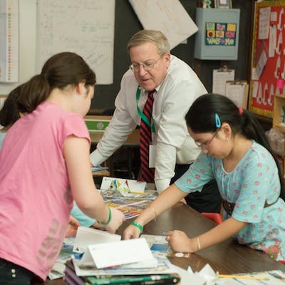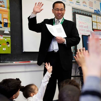 Cranston Mayor Allan Fung, works with first graders explaining the roles people play in the local economy as part of the JA Our Families program.
