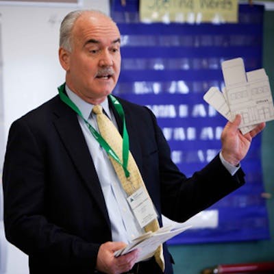 Bill Schwab, human resources officer at Amica Mutual Insurance, shows students how resources are combined to create goods and services in the JA Our Region program.