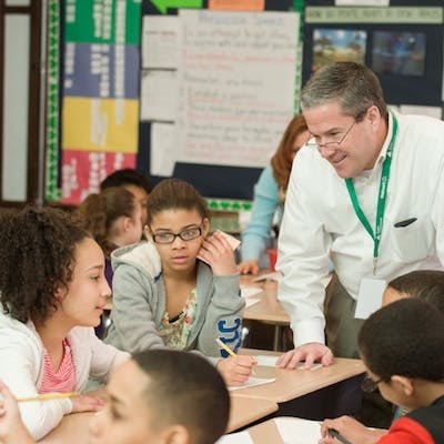 Jeremy Duncan, vice president of brand management and marketing communications at Blue Cross & Blue Shield of Rhode Island, works with 5th graders as part of the JA Our Nation program where students practice being entrepreneurs by turning ideas into businesses.