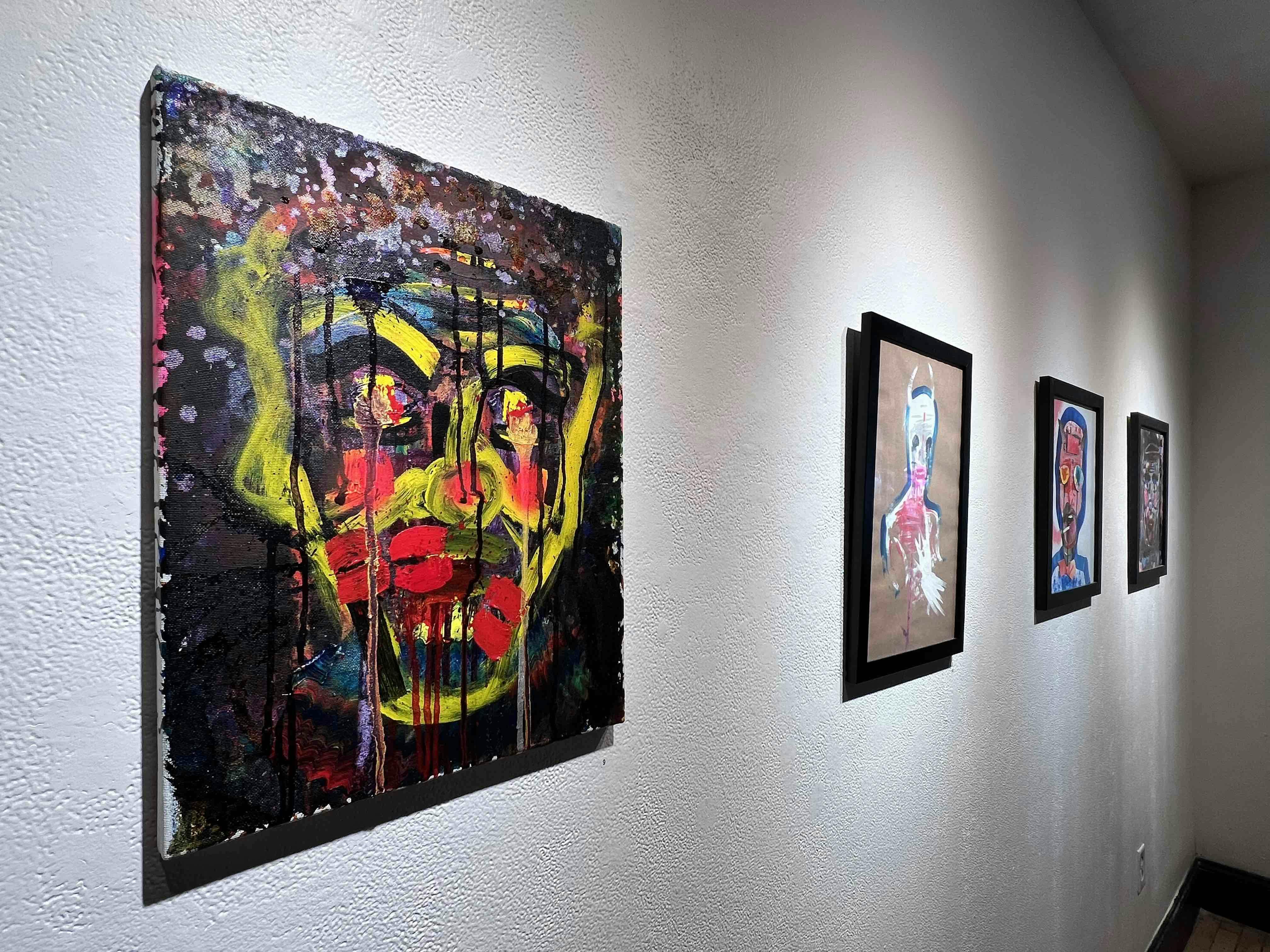 In the Main Gallery at 115 Empire Street, colorful and expressive imagery reigns. In this space, Anthony Medeiros is exhibiting opposite Robert Snowden. Punchy figuration shows up in the work of both artists, with Snowden’s coming in the form of recurring mask motifs. For Medeiros, subjects are sensitively and expressively rendered in grittily painted abstract forms. While there are some similarities in mode, these two artists diverge in scale. Medeiros’ show is relatively quiet and incorporates smaller scale works, while Snowden’s is a floor-to-ceiling experience. The pairing of these two artists leads viewers to draw connections between ways of making.