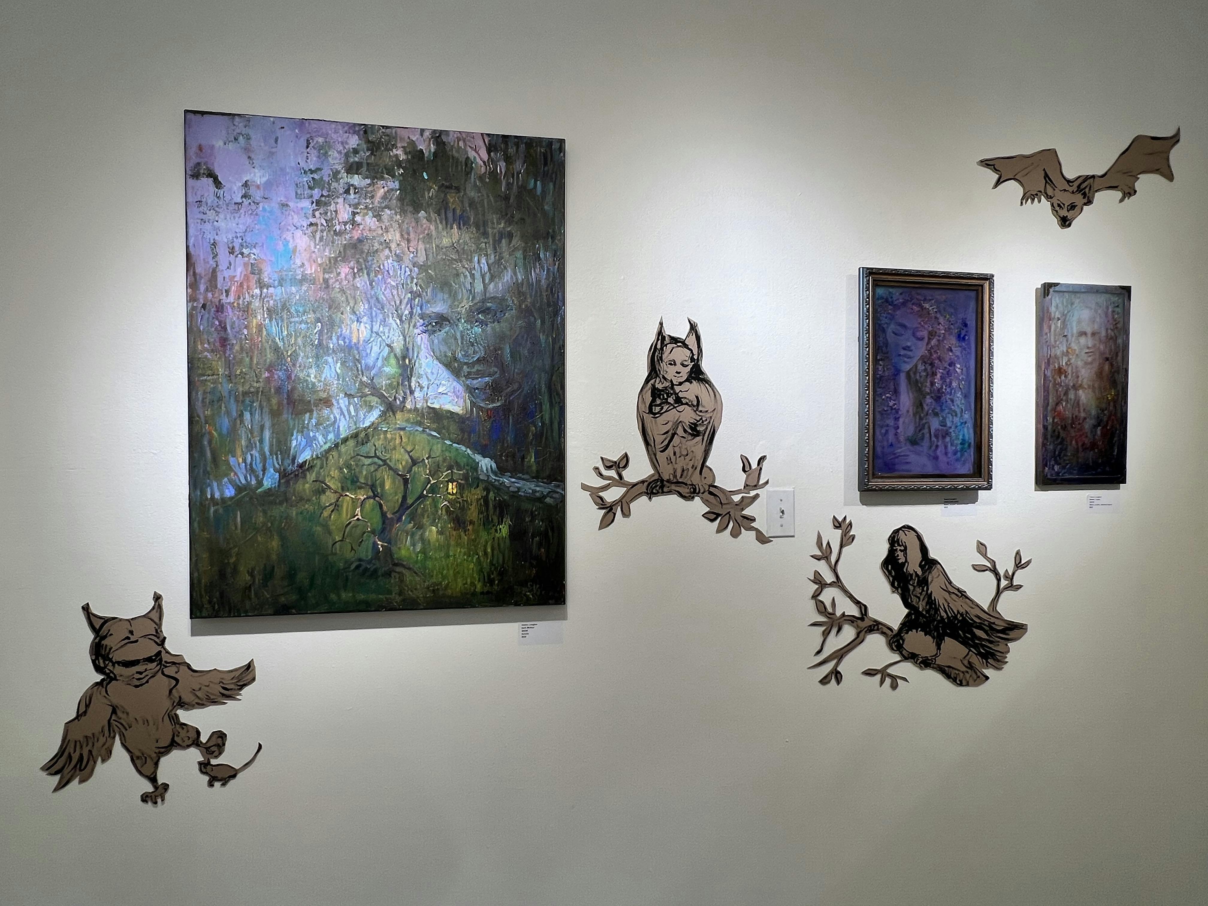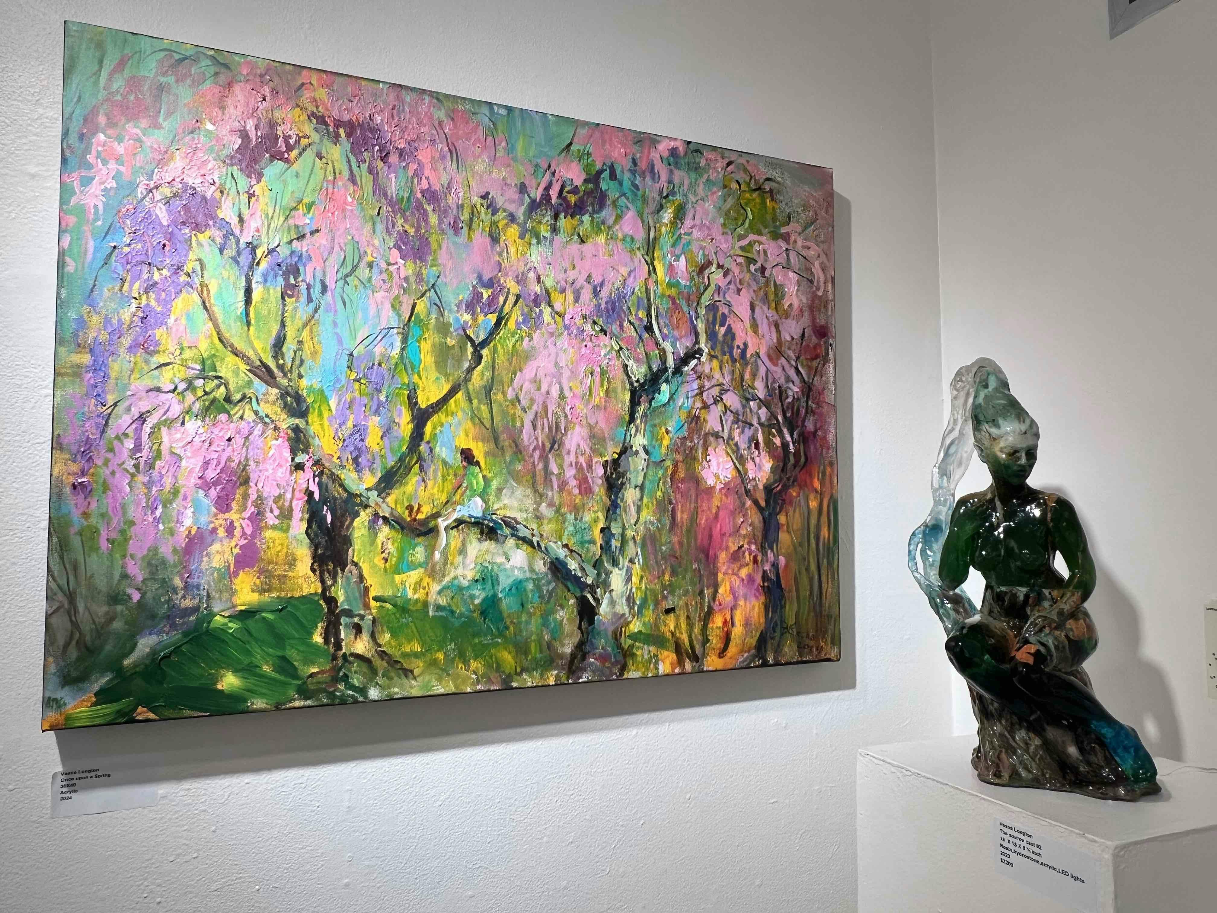 In her show, Longton offers a sense of imagination and interactivity, with viewers invited to pin wishes to a sculpture tree in the form of paper leaves. Her mixed media paintings employ layers of plexiglass as their base to achieve a three-dimensional effect. She also utilizes resin, and electric light. Seemingly few materials fall outside her scope of practice.