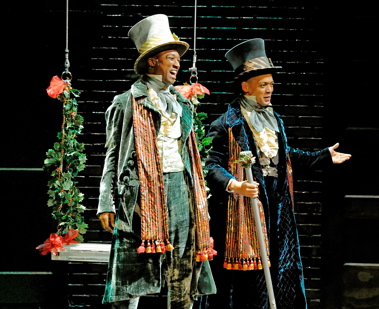 Around Scrooge, the cast performs ably, but without as much color as the design they fill. Janice Duclos gives Mrs. Partlet a few wonderful physical turns, and Sandy and Wilson add some fun mugging to their job-sharing appearance as Scrooge's present in Stave III. Brandon Drea gives nephew Fred a boyish earnestness that works and Richard Williams as Cratchitt has a few sweet (but rare) moments of comedy. The kids are adorable and as diverse as a Benneton ad.