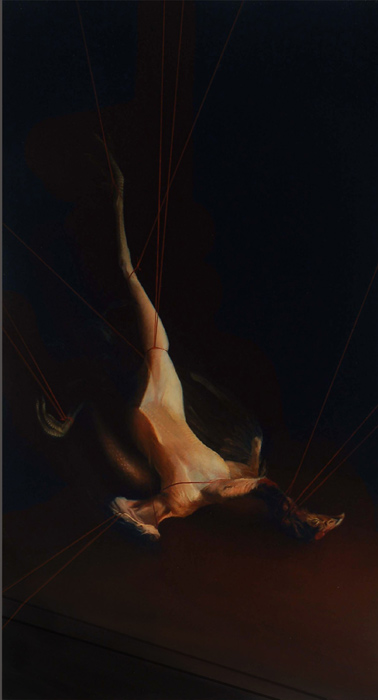 “My work seeks to force the viewer(s) to reconsider their relationship to both the chicken’s body depicted before them, and to their own flesh," Sorlien said in her artist's statment, which accompied the work. "I am interested in the way in which chickens can simultaneously be viewed as animal ‘other’ and as anthropomorphically human. Their bound, flayed and naked bodies serve to remind us of our own flesh. . . . The idea of manipulation, and the connotations of shame, humiliation and bondage that accompany it, play an important role in the work.”
