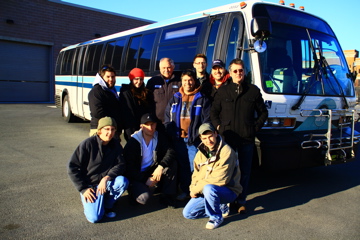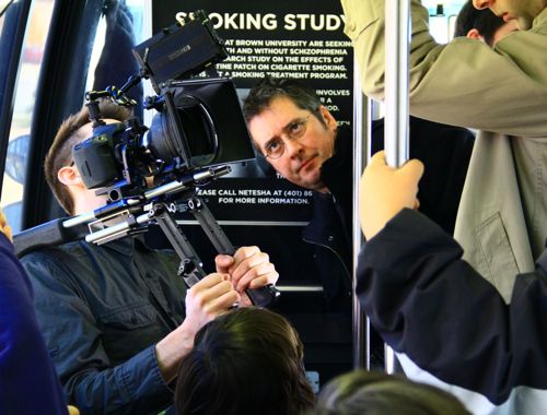 Photo, above right: Eric Weindel (Director of Photography) films while Bob Lucas (Director) watches the action. Above left: Crew members Joe Riccitelli (Boom Operator), Erica Mills (Production Manager), Nicholas Delmenico (1st Assistant Camera), Eric Weindel (Director of Photography), Anthony Ambrosino (1st Assistant Director), Bob Lucas (Director), Bill Hayes (Behind the Scenes Videographer), Kyle King (Key 2nd Assistant Director), and Matt Delisle (2nd 2nd Assistant Director) pose for a photo with their driver, Bill from RIPTA.