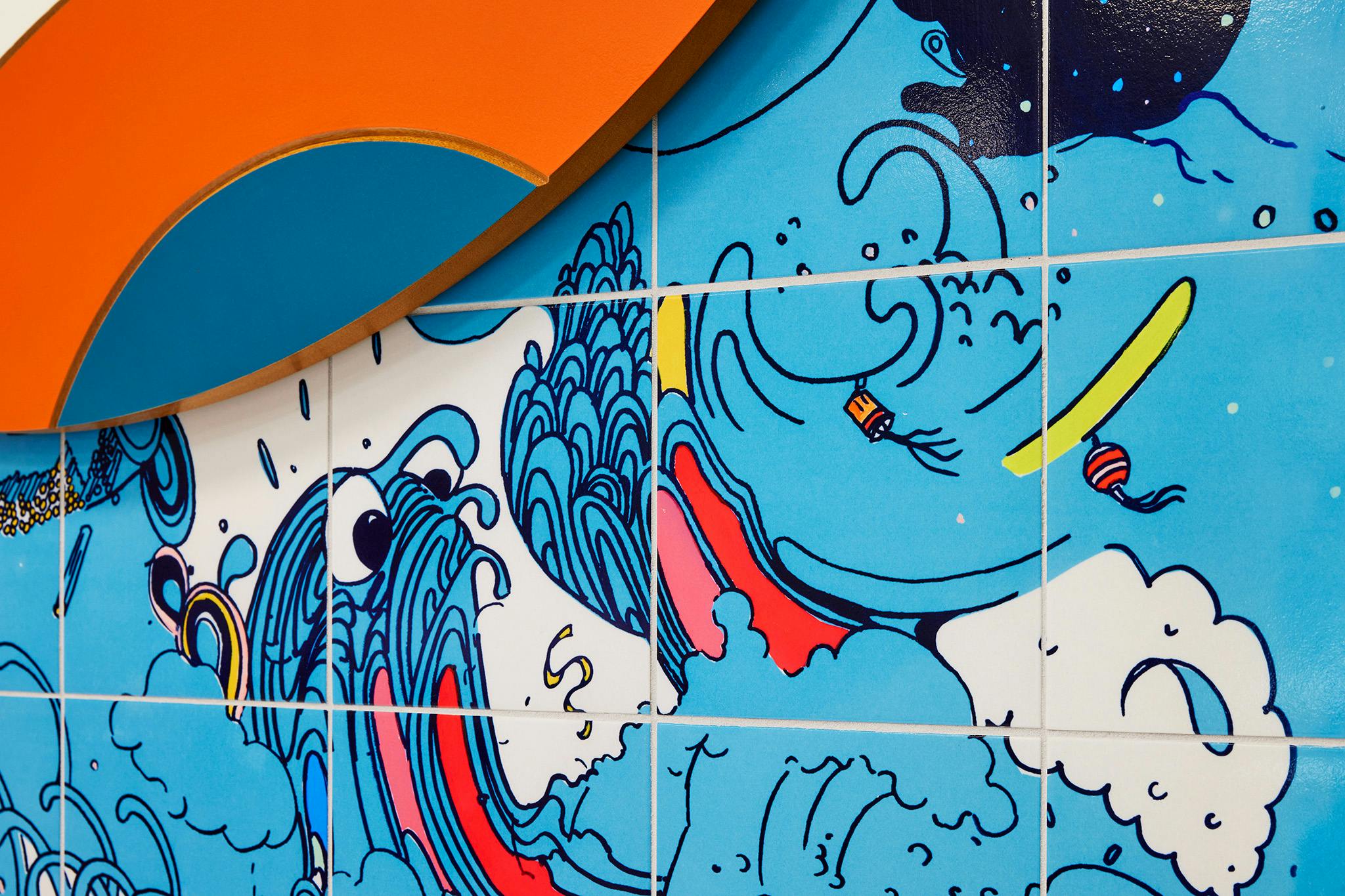 Primarily a printmaker, Bianco has shared her works on paper in numerous exhibitions across the country and internationally. Her new public art project in Brooklyn is a departure in medium but carries with it many of her recognizable themes. Describing the public art program and explaining the process behind her latest work, Bianco says, “Curious Tide is my first public art commission for P.S. 958 Brooklyn, through the New York City School Construction Authority, Public Art for Public Schools program. The program is great for artists who haven't previously worked on a larger scale because there is support from the program, via panels, directors and a project manager who can guide the translation of a medium like printmaking into new materials. For this project, my original screen prints were digitized locally at io Labs, and then printed onto porcelain at a tile company in Missouri. The mahogany suns were fabricated in the studio of local artist Ben Watkins.”