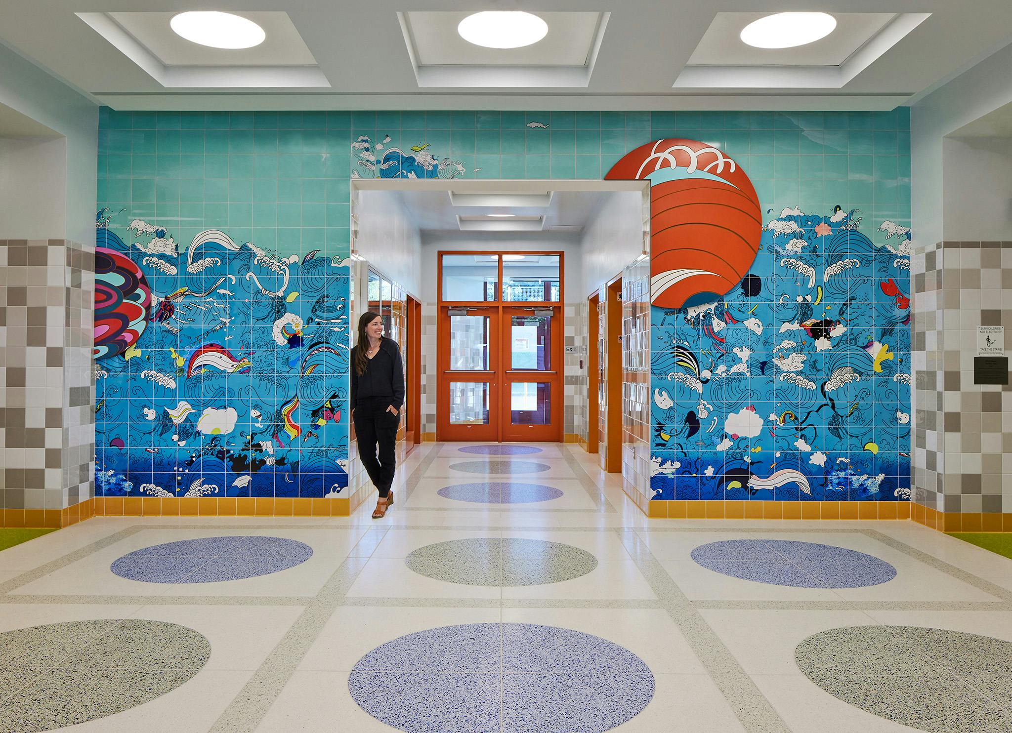 Reflecting on what excites her most about her commission in Brooklyn, Bianco is considerate of her own experience. She states, “In a way, it is like realizing a dream. For me, elementary school was the time when art making became important and exciting. I remember feeling so proud when my work was shown in the display case in the lobby of Old County Road School in Smithfield. To have the entire lobby of a new public elementary school in Brooklyn filled with my creation in a permanent way is beyond rewarding. I hope the kids love it.”