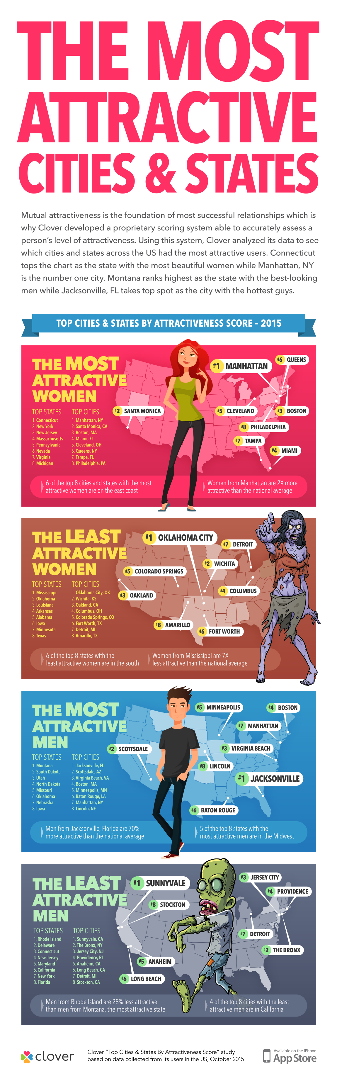According to the dating app Clover, "Using this system, Clover analyzed its data to see which cities and states had the most and least attractive users. Connecticut tops the chart as the state with the most beautiful women while Manhattan, NY is the number one city. Montana ranks highest as the state with the best-looking men while Jacksonville, FL takes the top spot as the city with the hottest guys."