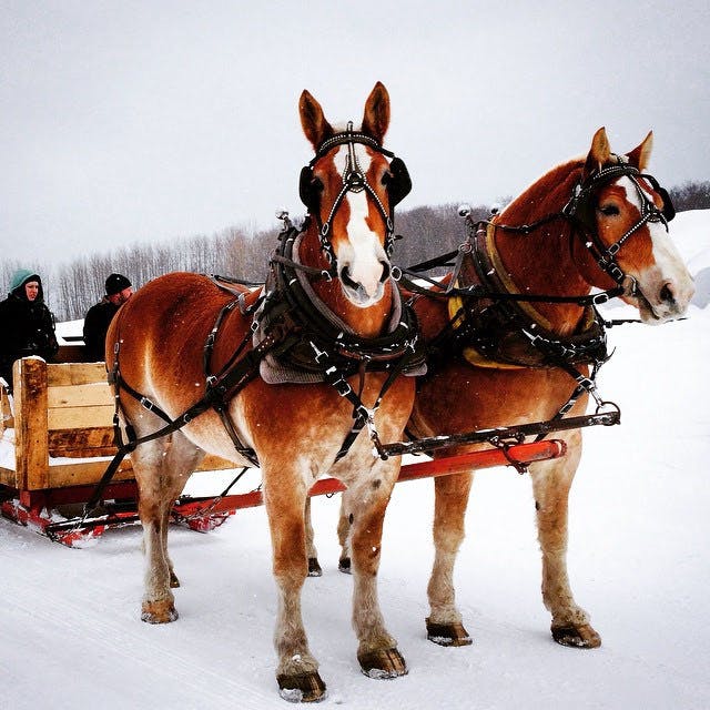 Enjoy the snow and scenery with a horse-drawn sleigh ride from Chepachet Farms and Sugar House in Chepachet, RI. A team of horses pulls an eight-person sleigh along wooded trails for a 35-40 minute ride. Afterwards, riders are welcome to enjoy hot cocoa by a woodburning stove in the farm house.