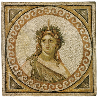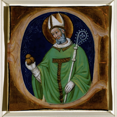 From top: Roman, Daphne, near Antioch, Floor mosaic fragment depicting Bacchus, 325-330 CE, Colored stone and marble; 46 ¼ x 46 ¼ in. Museum Collection, by exchange 40.195. Master of the Brussels Initials, Italian, b. Bologna, active in Bologna, Padua, and Paris, ca. 1390–1420. Saint Nicholas, ca. 1410–1420. Watercolor, shell gold, leaf gold, and lapis lazuli on vellum. Mary B. Jackson Fund 2010.19.2.