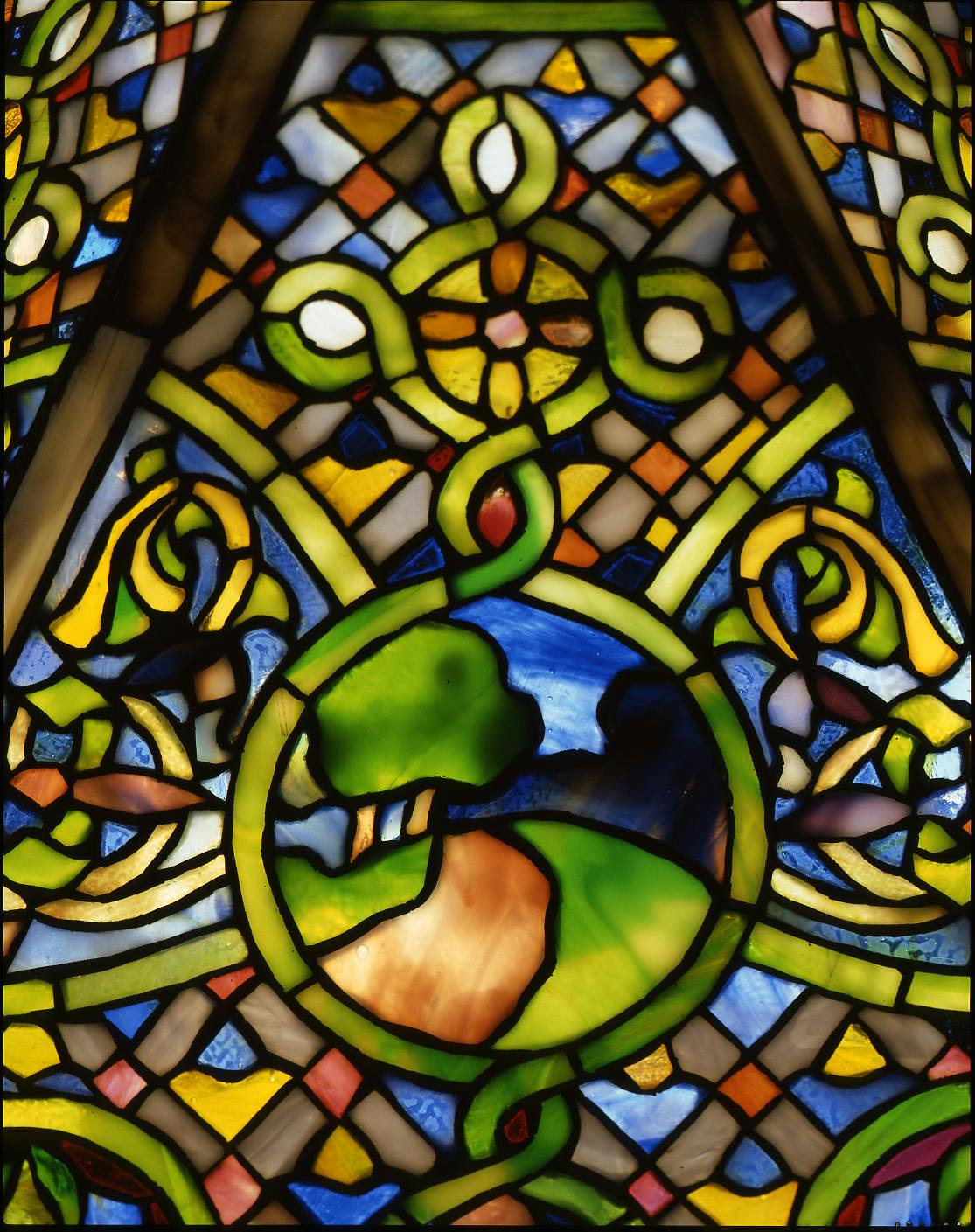 The exhibit is composed of five windows, 19 lamps and over 100 pieces of opalescent flat glass and glass “jewels.”