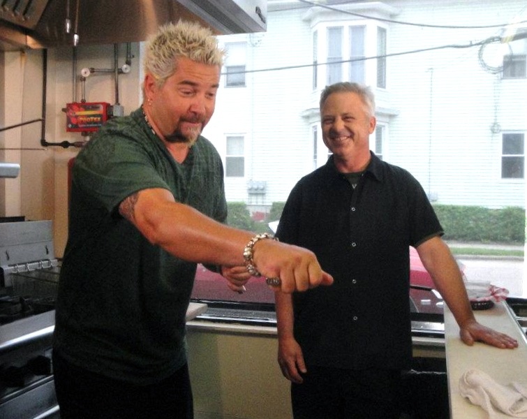 Just a dash: Food Network megastar Guy Fieri with John Walsh at Cranston's Edgewood Cafe. Photo: Edgewood Cafe.Guy Fieri update: We spotted him on arrival in Providence last week, and the Food Network megastar did not disappoint over the next few days of his stay. The Diners, Drive-Ins and Dives host not only dined at Federal Hill's Mediterraneoas we reported, but went on to film at the Edgewood Cafe in Cranston and theItalian Cornerin East Providence. Fieri also raved via his very active Twitter account about the Ocean House in Watch Hill. "Killer place," he pronounced the resort, which last saw heartthrob Hugh Jackman tweeting its wonders.