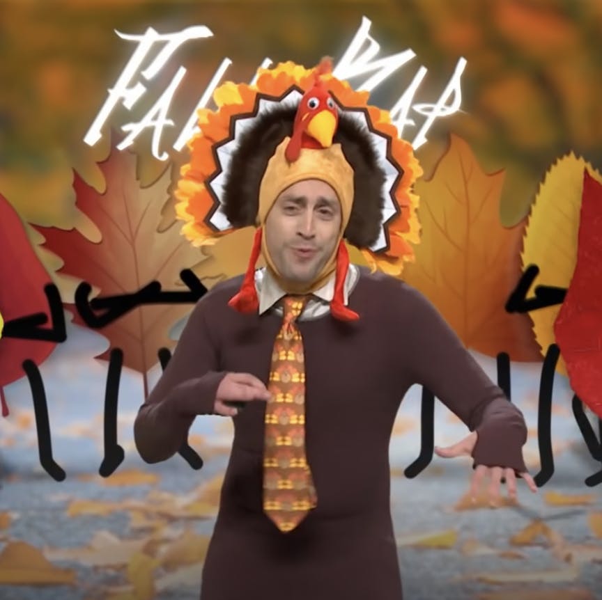 Actor Kieran Culkin, playing a weatherman, performs a rap about fall, as a dangerous storm approaches.