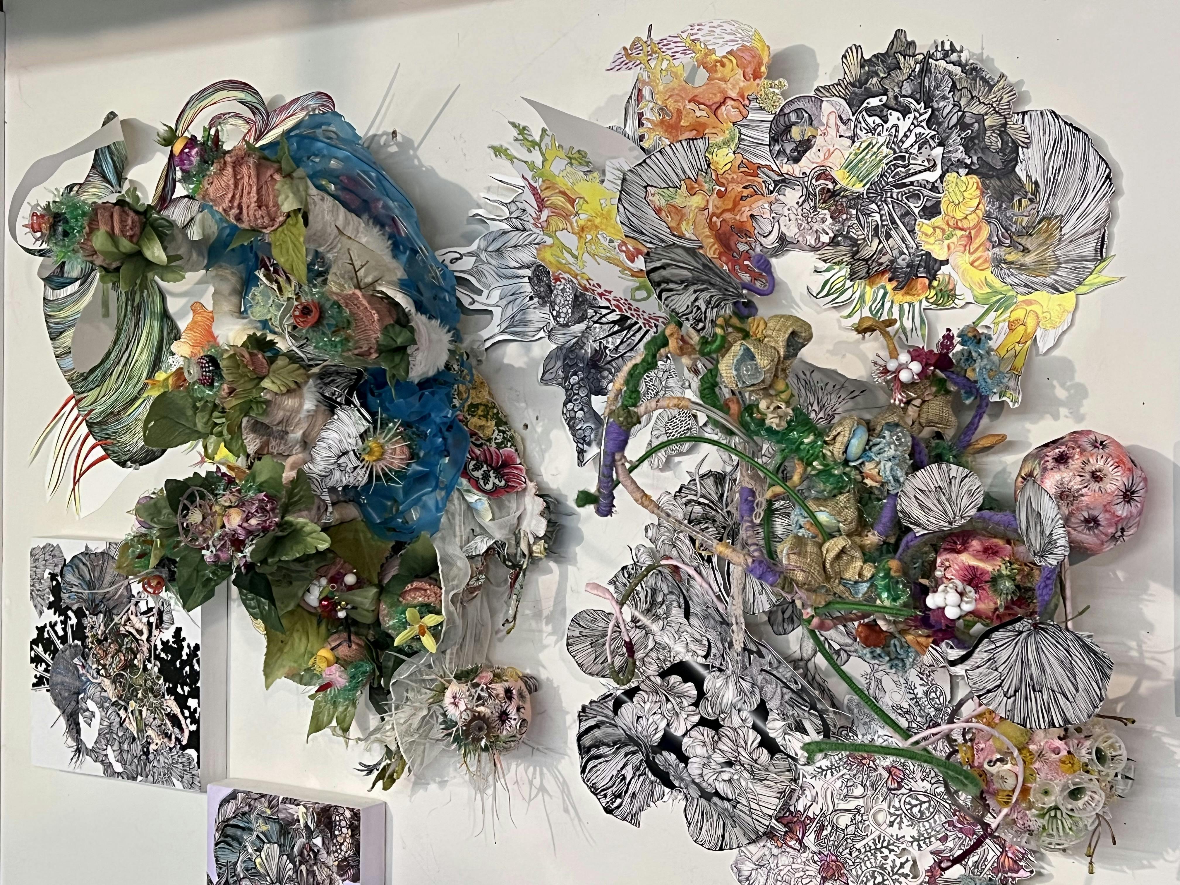 Considering the question of what she hopes viewers experience when seeing her work on view at Overlap, Renadette responds, “I make my tangled sculptures from salvaged commemorative and celebratory items, mixed with familiar textures, textiles, and objects, in order to suggest an interconnectivity between peoples' lives. These intricate arrangements are invitations to look deeper, and reflect on our internal and external experiences. With our collaborative work, I hope that viewers might feel like they've just been immersed in a garden that is both tended and growing wild in sections - hopefully, it feels like an environment of discovery and new possibilities.”