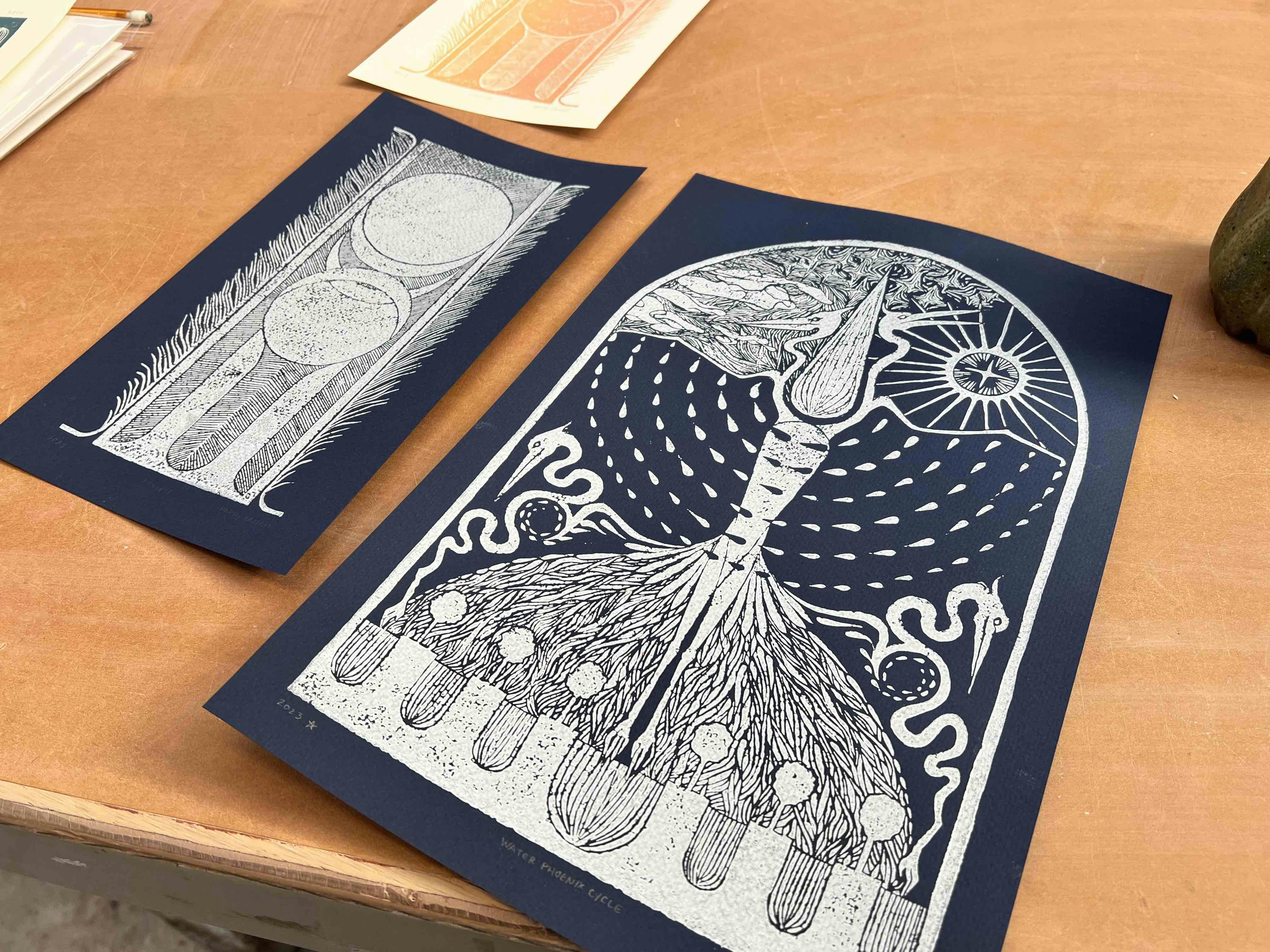 A gifted artmaker, Cassell is a quick study and easily leverages new techniques. In addition to furniture, blacksmithing, and ceramics, she has also recently taken up block printing and is already producing refined and precise imagery that ties in nicely to her existing body of work. These works also display the artist’s love of organization and structure.