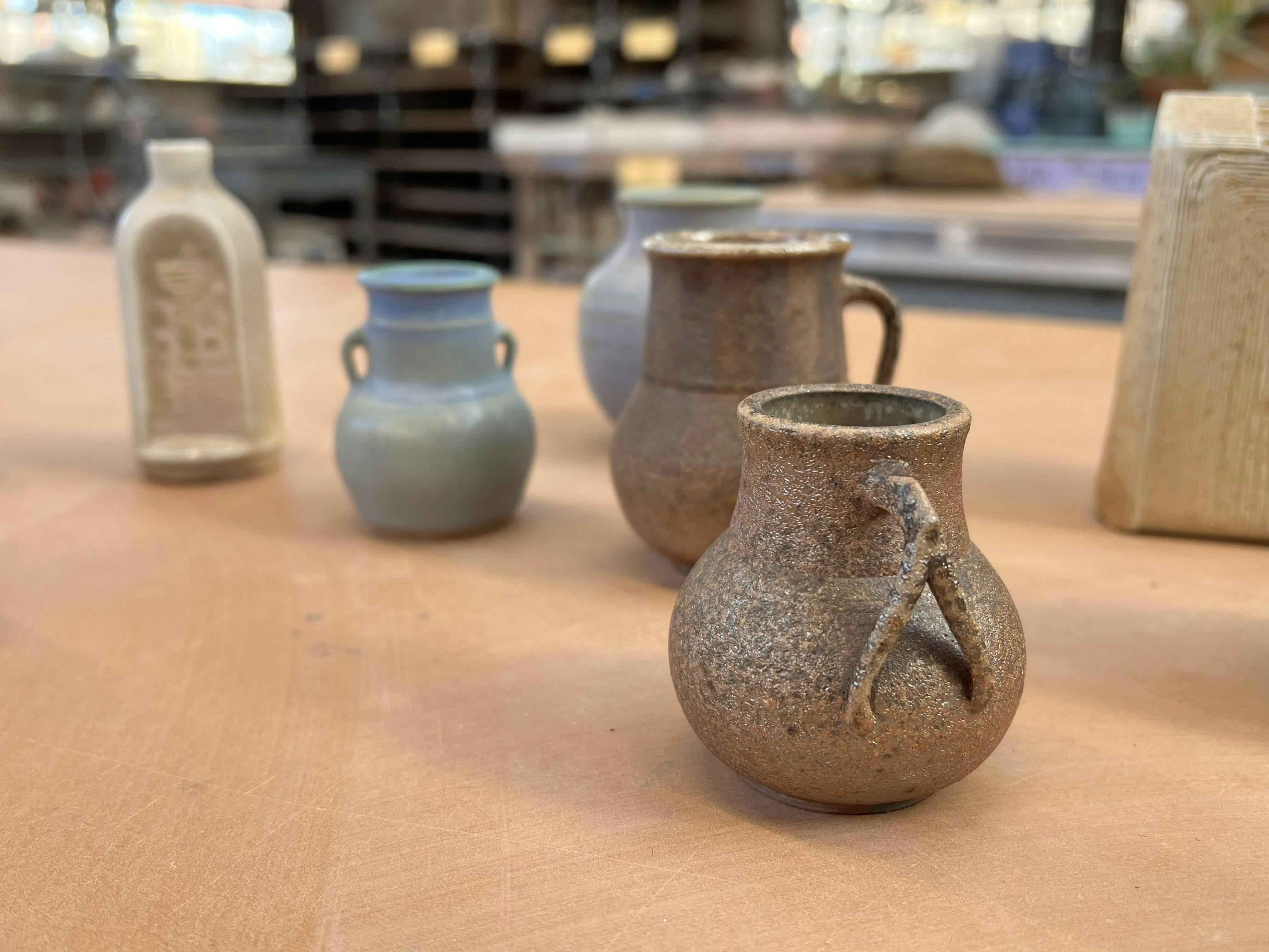 Cassell’s exploration of different techniques has been enhanced by her association with The Steel Yard, where she is a second year resident focused on ceramics. On a recent visit to Cassell at the Providence industrial arts hub, the artist showed off her neatly organized resident’s station filled with the materials needed to craft her ceramic artworks. Shelves in her studio cubby are lined with carefully labeled containers for glazes, and ceramics in various stages of completion are also on display. On a nearby shelf, recognizable forms await firing and glazing.