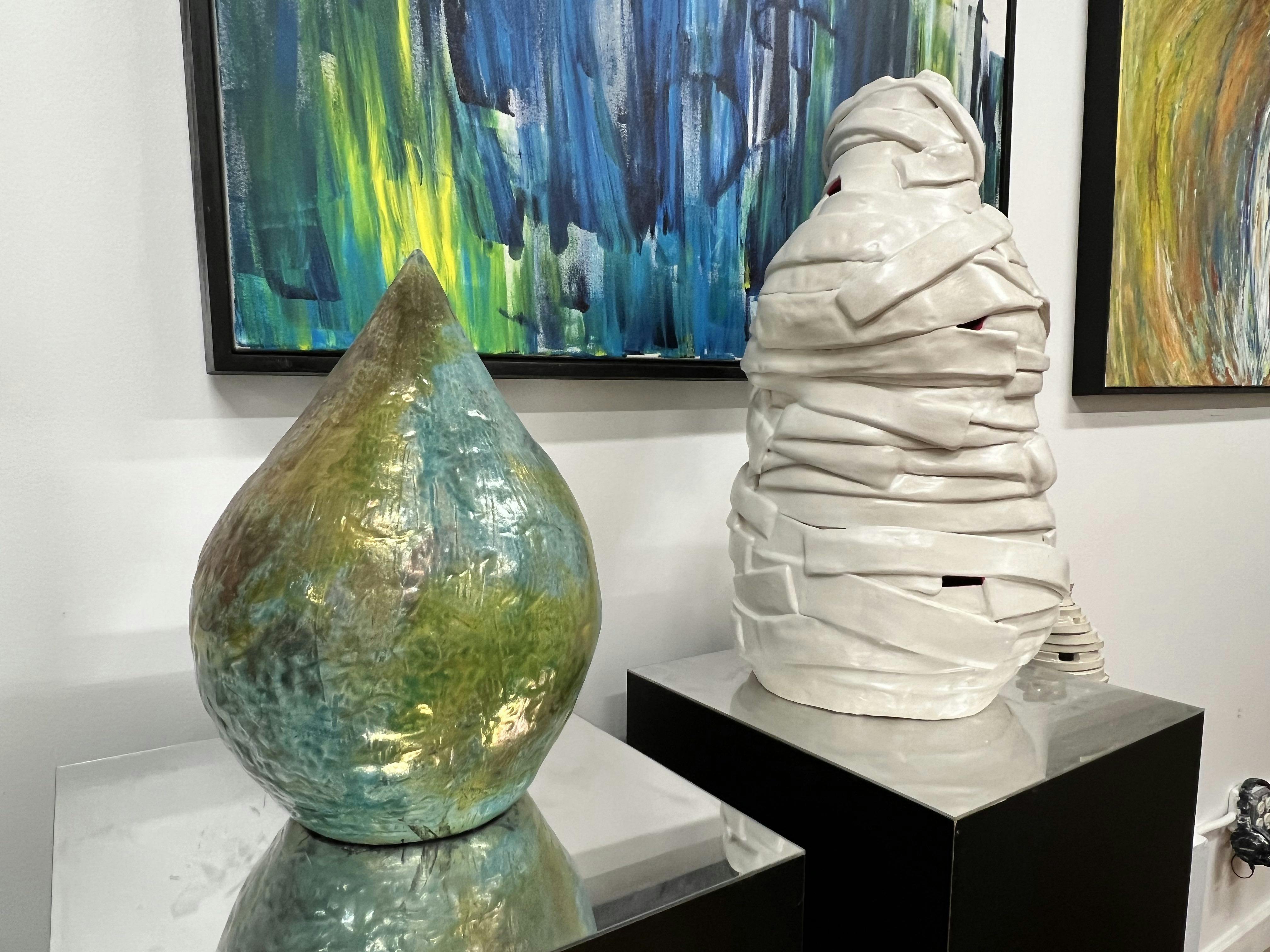 Carpenter is deeply involved in the local arts community, holding memberships in a variety of organizations, including Plymouth Center for the Arts, Attleboro Arts Museum, Wickford Art Association, and South County Art Association, among others. She is a previous resident of The Steel Yard in Providence and regularly participates in Wickford’s Art Festival and other fairs. Her work is wide-ranging, from voluminous ceramic forms, to edgy steel sculptures, to expressive paintings tinted with metallic pigments.