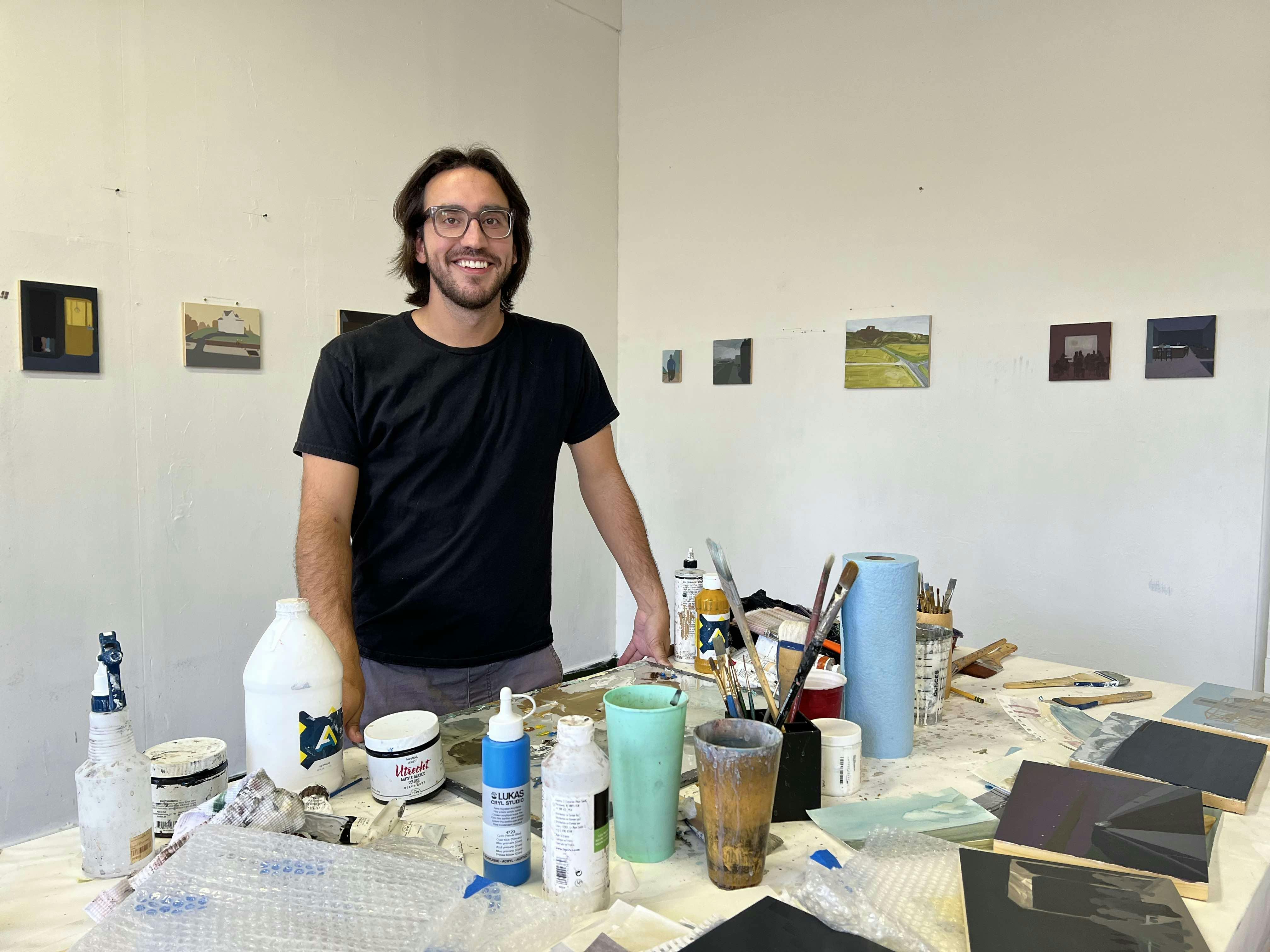 Outside Luke Morrison’s new studio on Harris Avenue, the sounds of the train and the highway blur together, creating a symphony of urban noise. Inside, the artist is at work on a series of modestly scaled acrylic paintings that explore cities and narratives. A painter and teacher, Morrison is making a place for himself in the Providence cultural scene and producing unique artworks in the process.