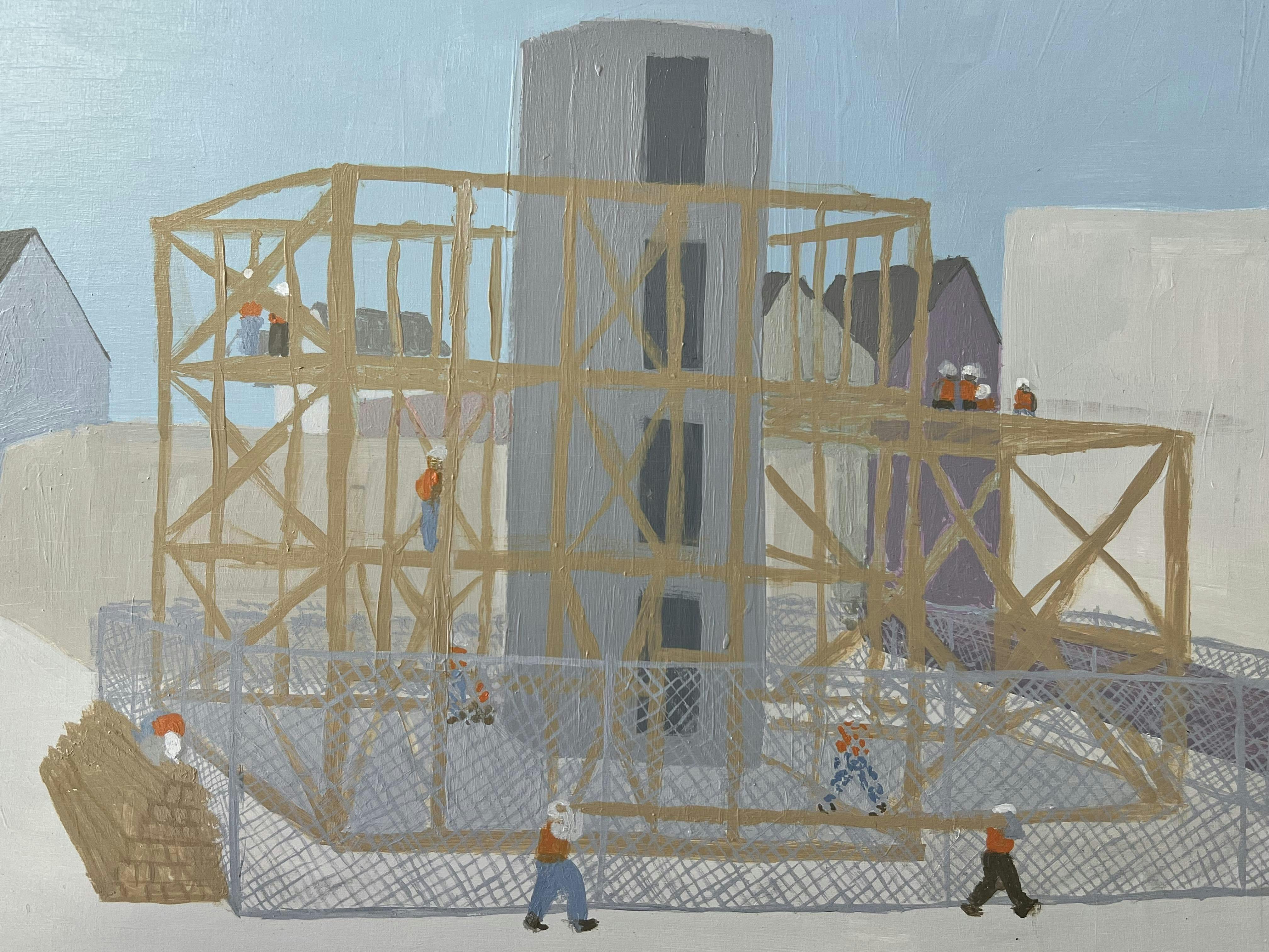The view from his creative space consists of train tracks, Route 6, and the edge of Federal Hill. These are the makings of creative inspiration for an artist who is interested in cities, architecture, and flat planes of color. Within his paintings, there are also characters interacting with space. One image shows a tiny road crew at work on a street, another has a bouncer balanced with a crowd outside an anonymous nightclub. Morrison’s paintings are at home in the tradition of American art that has put stories like this at its center. His subtle palette sets these scenes apart.