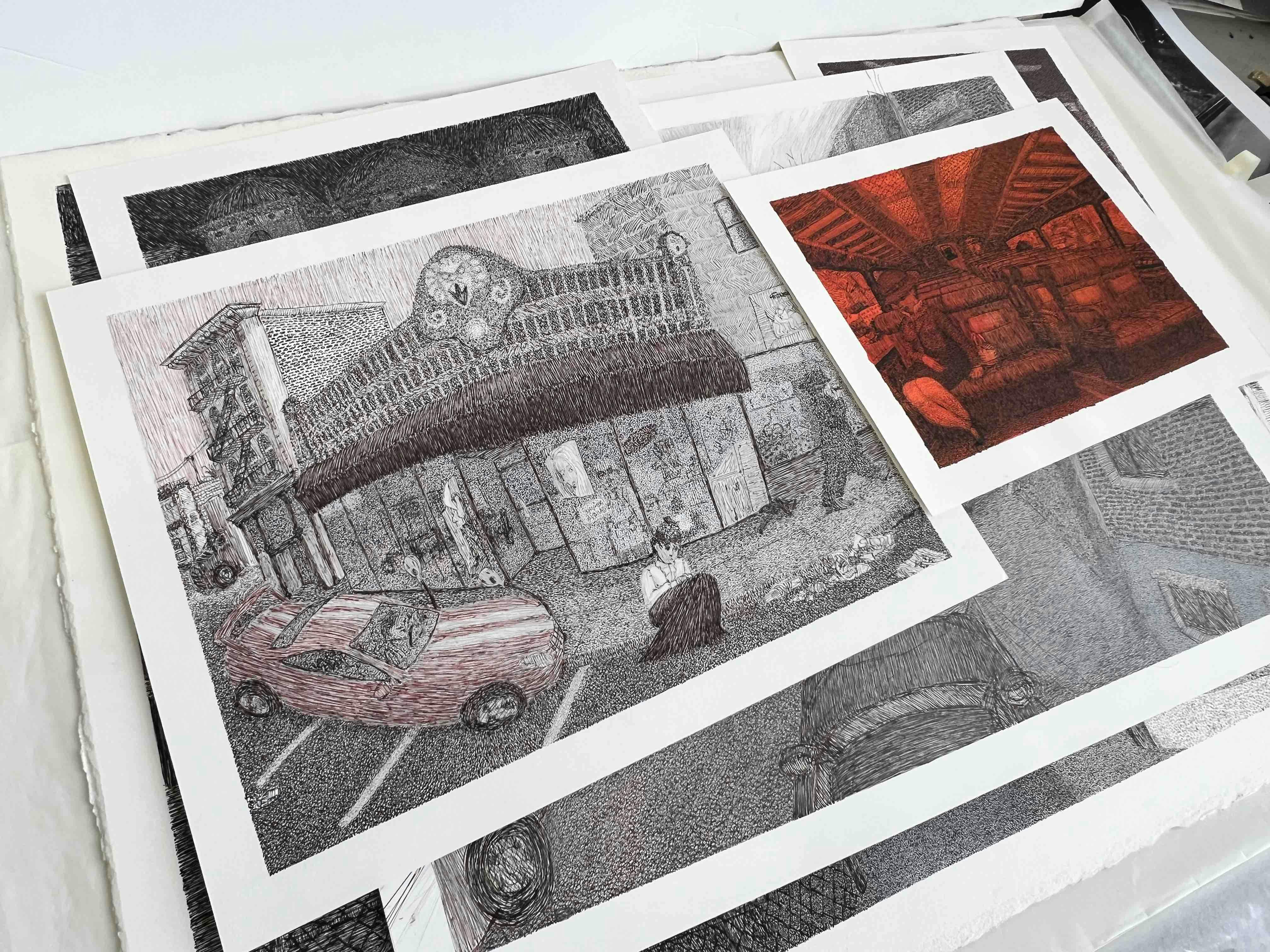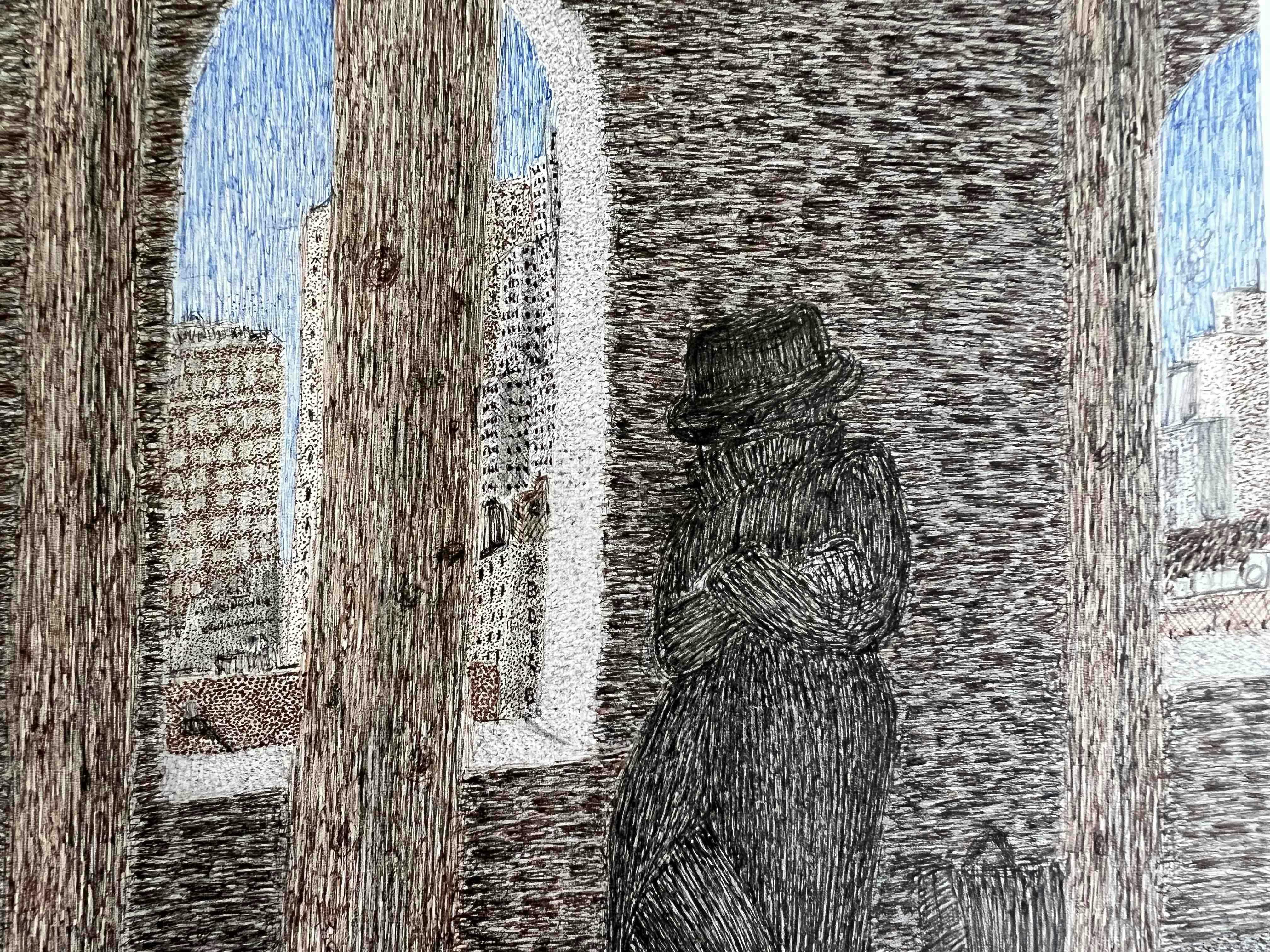In addition to acrylic paintings, Morrison is an avid sketcher and has a pile of sketchbooks in his studio, all filled with ideas. Across many pages, there are rotund characters and layered architectural scenes. He also completed a series of remarkable drawings in ballpoint pen. These pieces are intense, immersive, and atmospheric, bringing viewers into urban scenes that are filled with line and shadow. They form a counterpoint to his paintings.