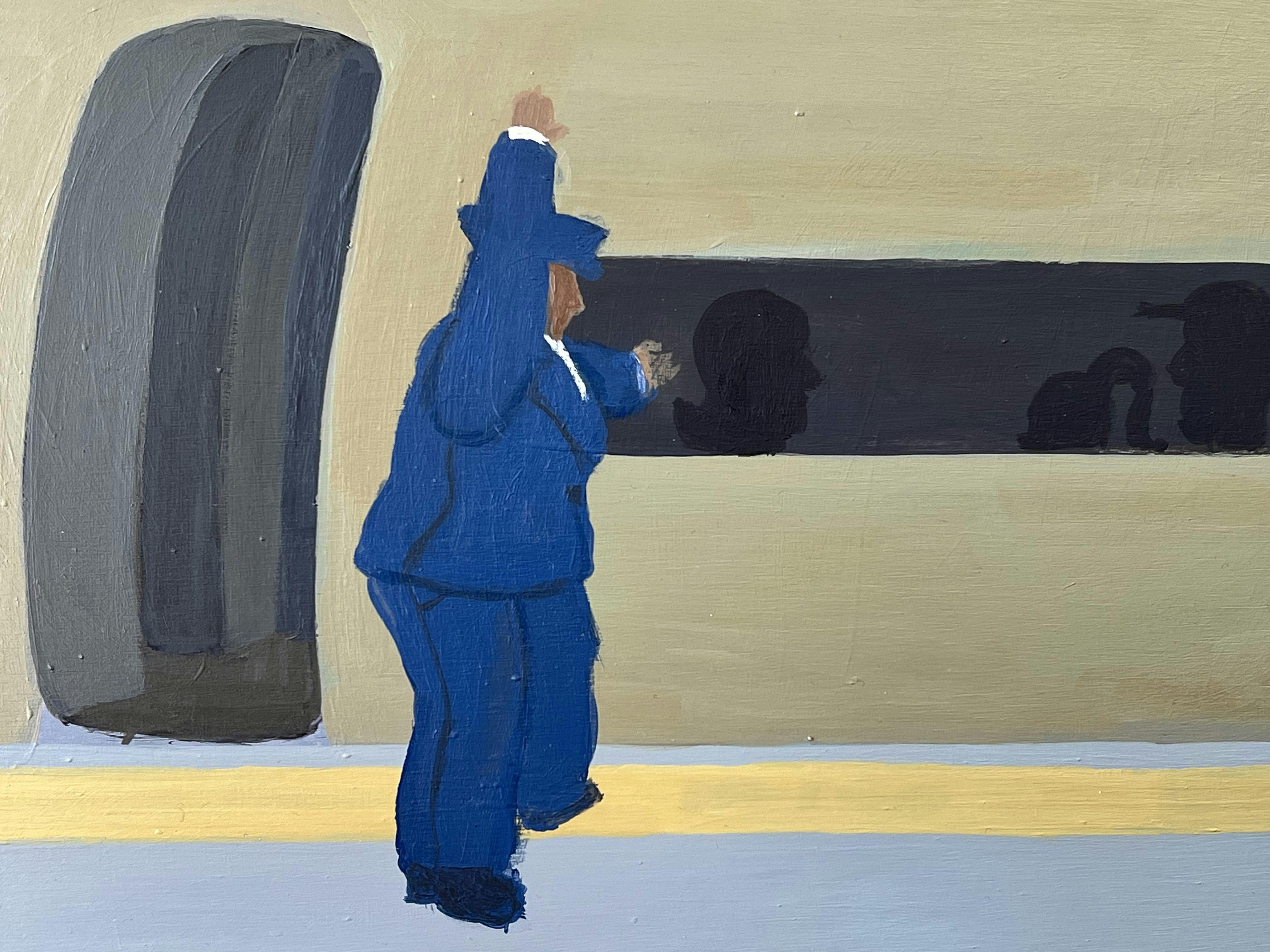 Asked how his background in theatre and drama has influenced his painting, the artist responds, “I aim to instill an ambiguous but engaging sense of narrative in my work, especially in the ways multiple works interact with each other, almost like different scenes or acts. I think formally there’s a very stage-like, voyeuristic effect to my street scene compositions and subject matter. I’m interested in the way distance from a stage and level of attention to small moments can influence your interpretation of a story, which happens depending on where you’re sitting during a live theater performance or where you’re standing on the street while seeing something unfold.”