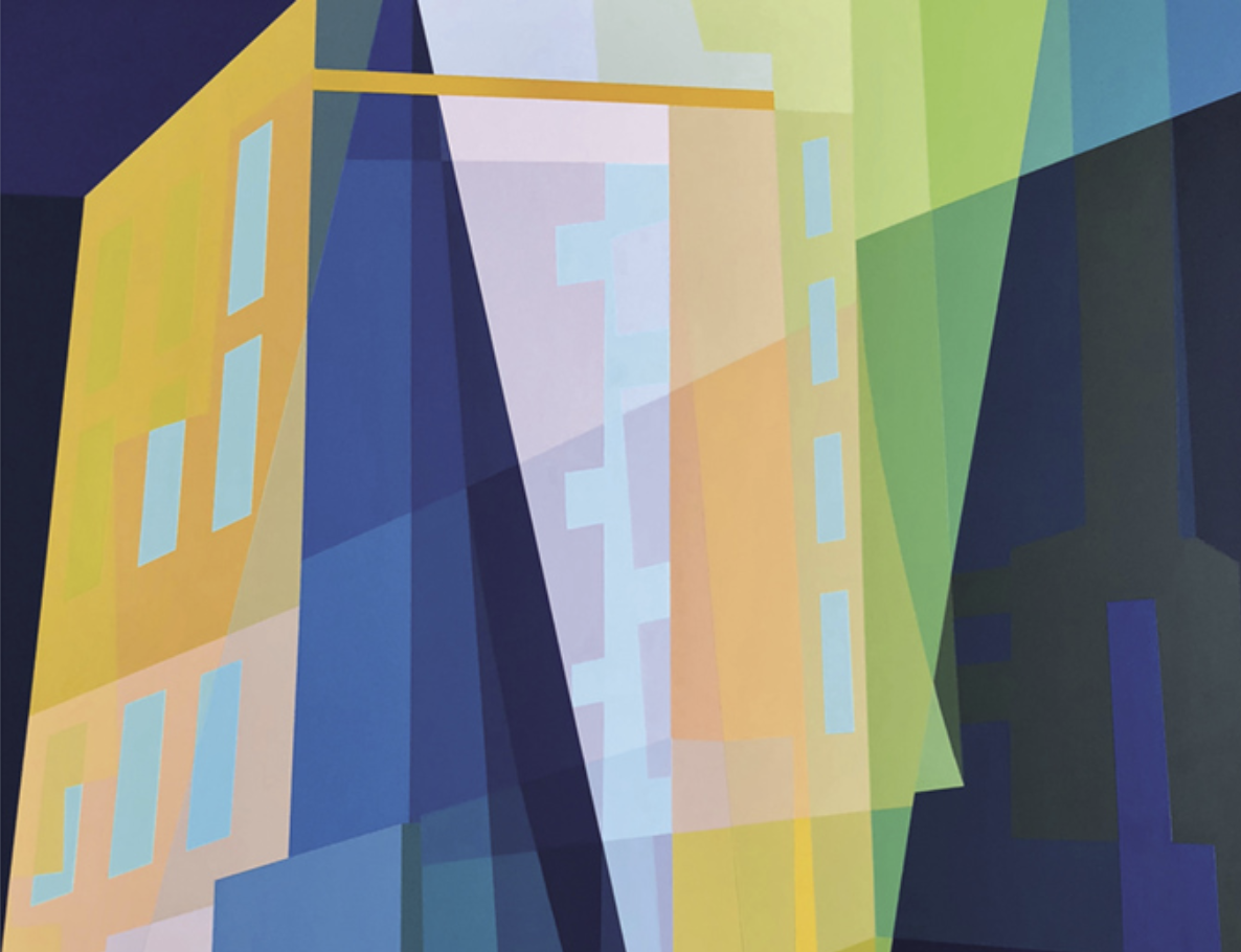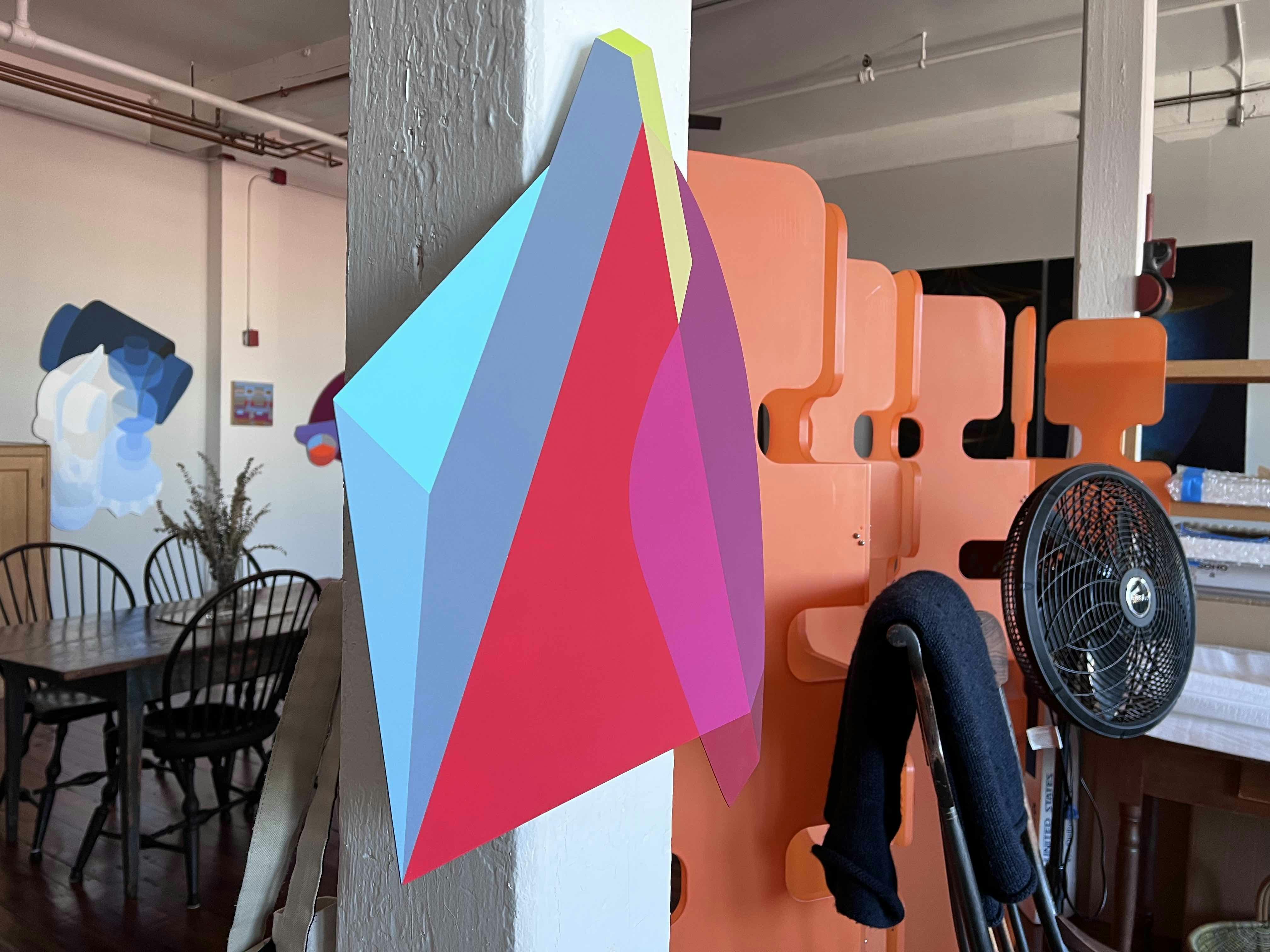 Speaking of her process, Hellman says, “When I broke my neck 18 years ago, I had to completely rethink my physical approach to making work. I started back using colored pencils, a straight edge and Canson Mi Teintes toned paper. By the time I moved to Providence in 2012, I had regained enough upper body mobility to use paint, so I began making small paintings on birch panels, taping edges and applying multiple flat coats of acrylic colors. Doing larger work has become possible, but I continue to use a straight edge, tape, plus a ship’s curve, and apply paint the same way. All my work begins with a line drawing, the reading of which is ambiguous. It is only with the development of color that I discover where it is headed.”