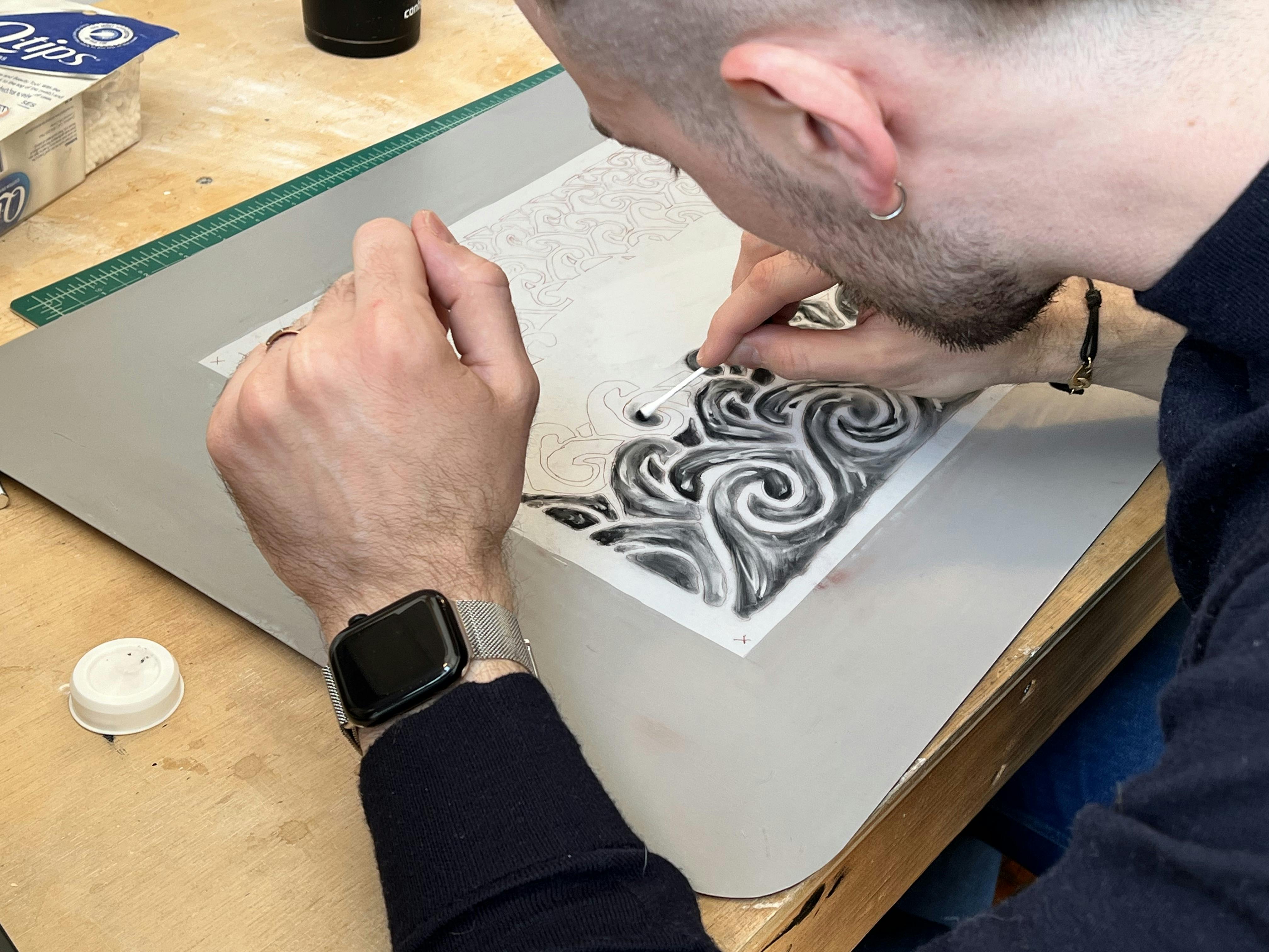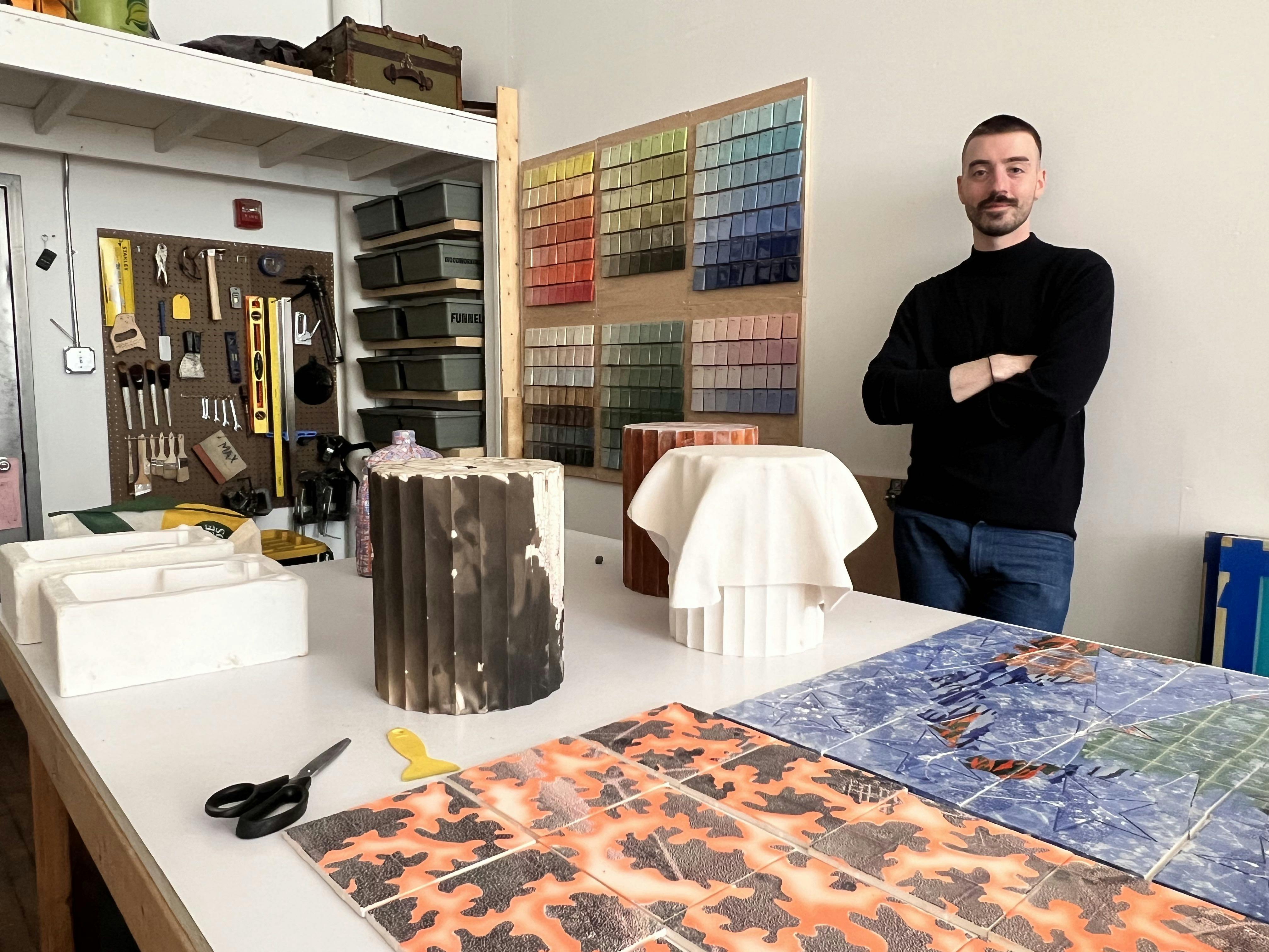 Asked what he has enjoyed most about establishing his art practice in Rhode Island, Lefebvre enthusiastically answers, “Graduating from RISD connected me with many talented creatives, and I've cherished meeting artists at places like the Steel Yard or in my current studio in Pawtucket. Providence's dynamic art scene is truly inspiring, and it's incredibly energizing to be in contact with so much talent. The proximity to the ocean and the coastline is also creeping into my work; I've been experimenting with a wave pattern reminiscent of the one found on our license plates.”