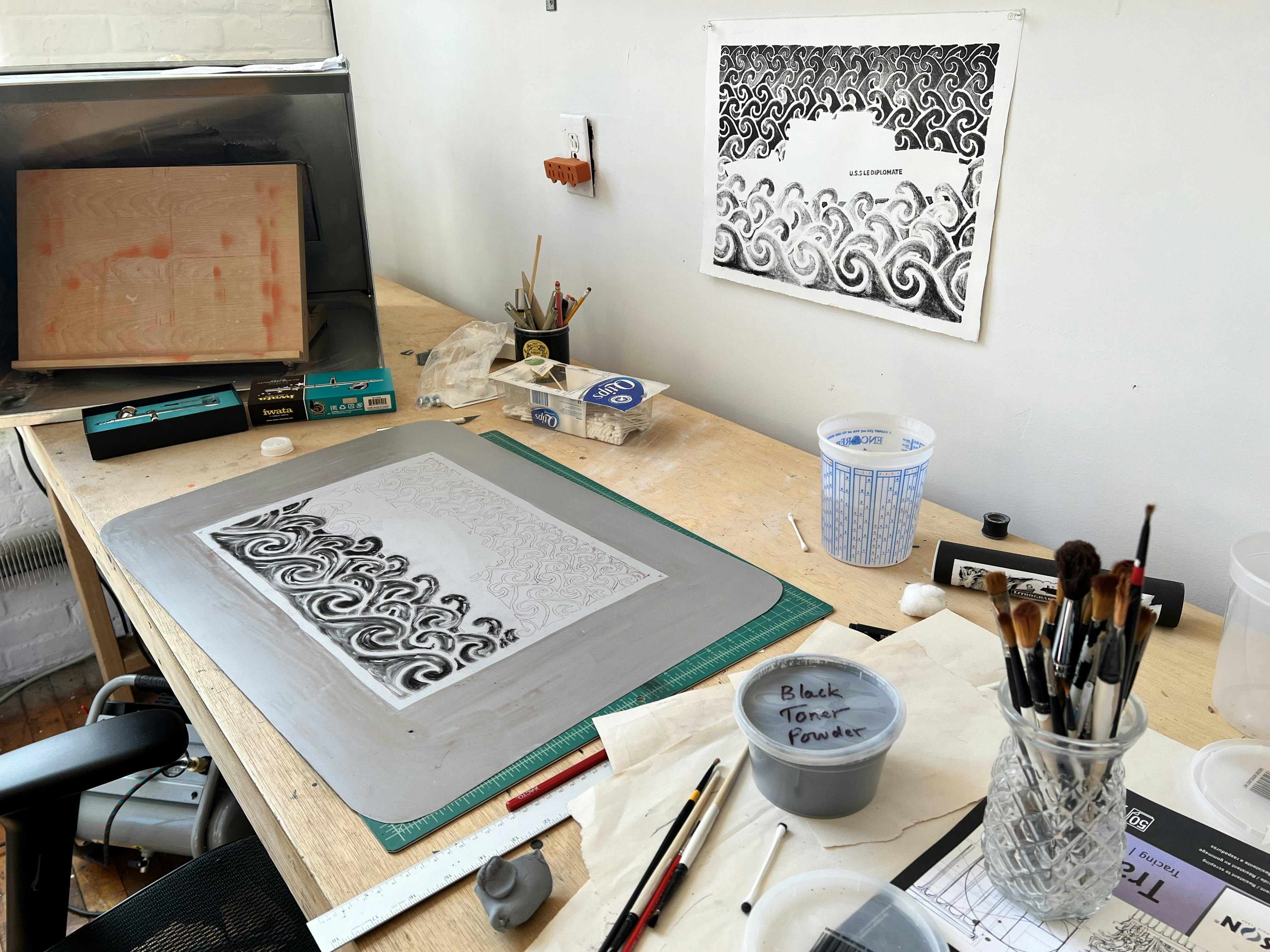 Much of Lefebvre’s work is experimental and pushes boundaries both narratively and technically. In a new print in progress, he uses printer toner as one element of a contemporary lithographic process. In slow strokes with a Q-tip, he applies subtle tones of blacks and grays to achieve a painterly effect on his plate. Emerging from his labor, one finds rhythmic and exacting waves that set off the geometric form of a Coast Guard cutter.