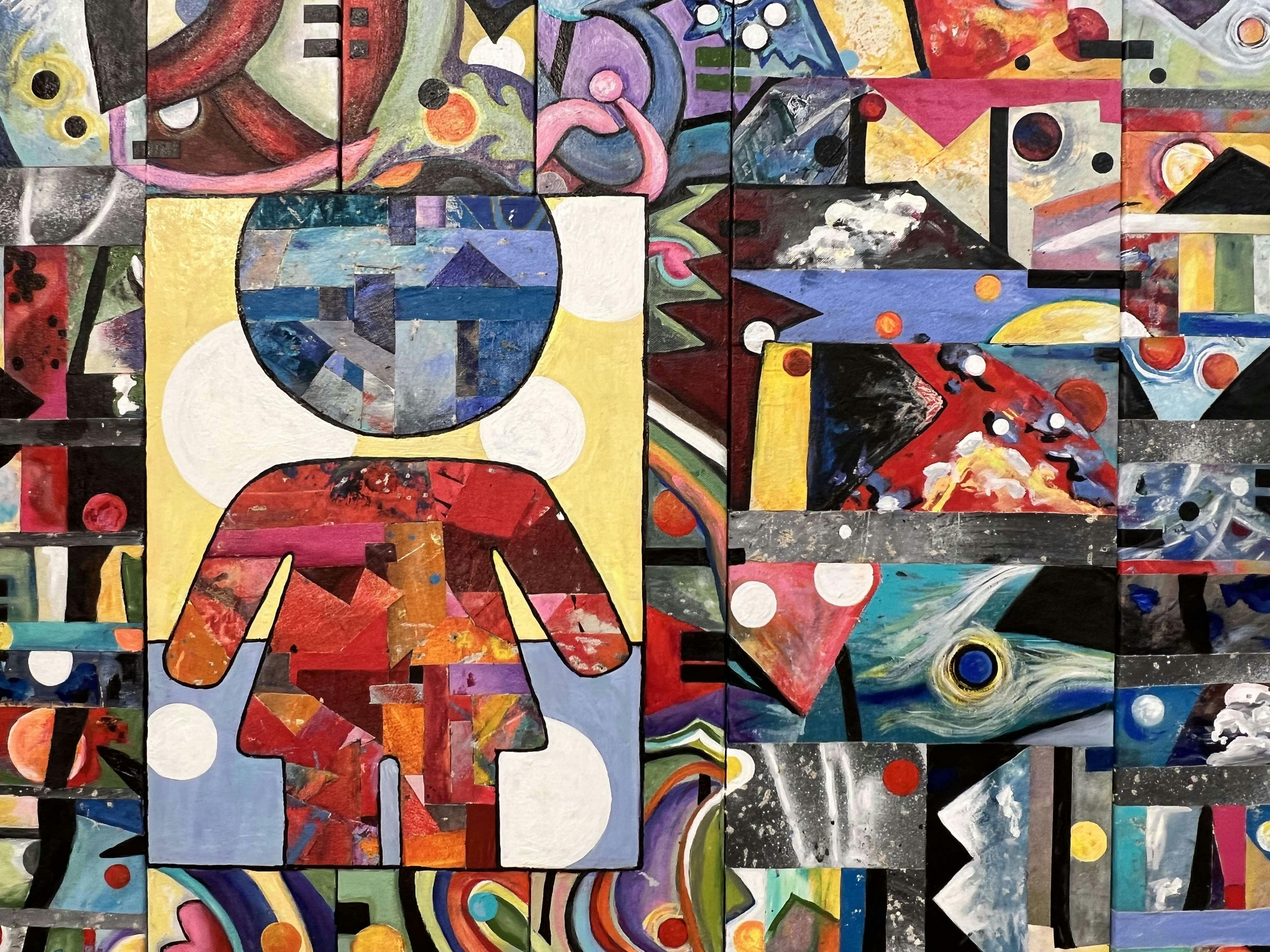 A visit to Cutts’ studio at 80 Fountain Street in Pawtucket reveals a space packed full with materials and completed works. Much of the artist’s production are pieces that are labor intensive including thoughtful mosaics that utilize small cut canvas elements to make up larger forms. Asked about what process means to her work, Cutts says, “I value the amount of hard work that I put into my art. Partly, it's because it is a way of connecting with others. I feel that the more energy I put in, the more energy viewers will get out of a painting or sculpture. Effort is not wasted, it is transformed and projected. As for how I begin a painting, ideas flood into my head, usually when I'm in bed or driving alone. It's a torrent, and I sift and winnow until I know what I want to do. Then I begin. I do not suffer from an artistic block or anything like that. I always want to work. Usually, I enjoy new technical and compositional challenges. New techniques and problems to solve are a lot of fun for me.”