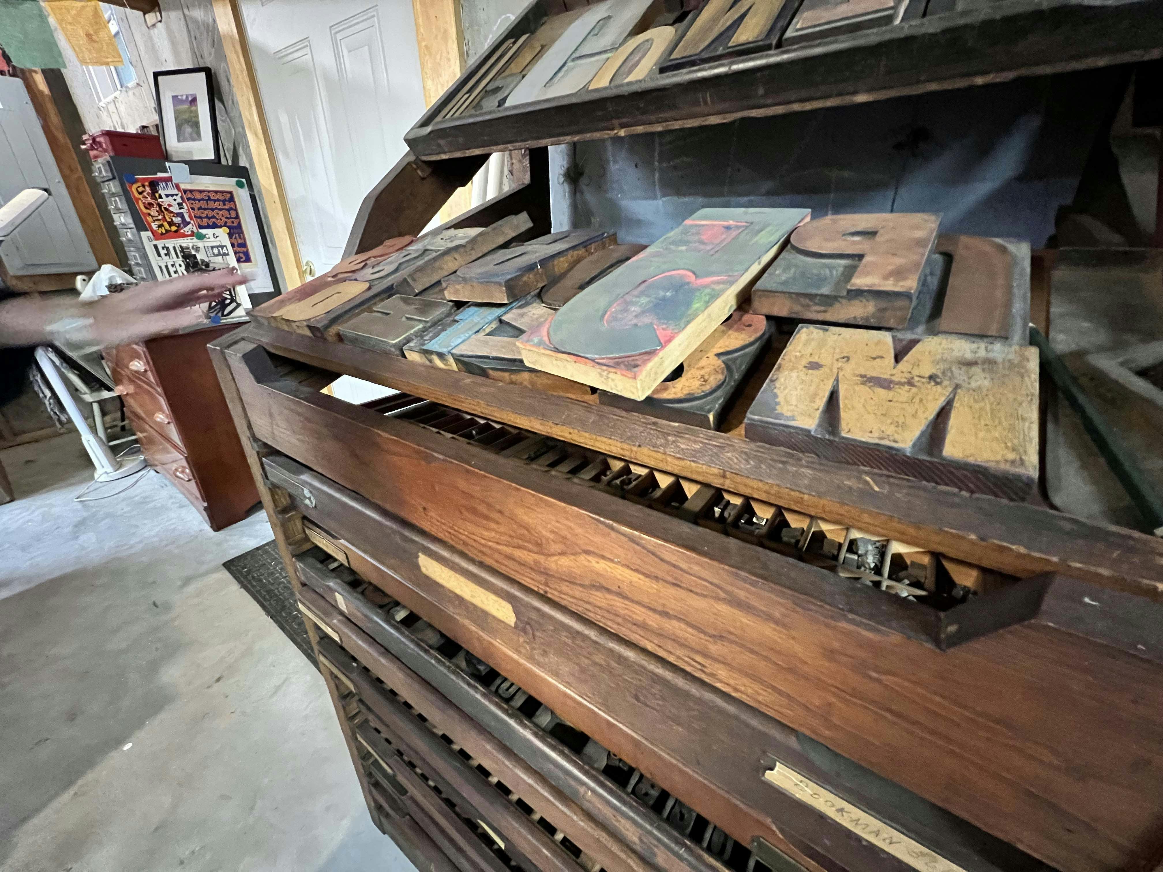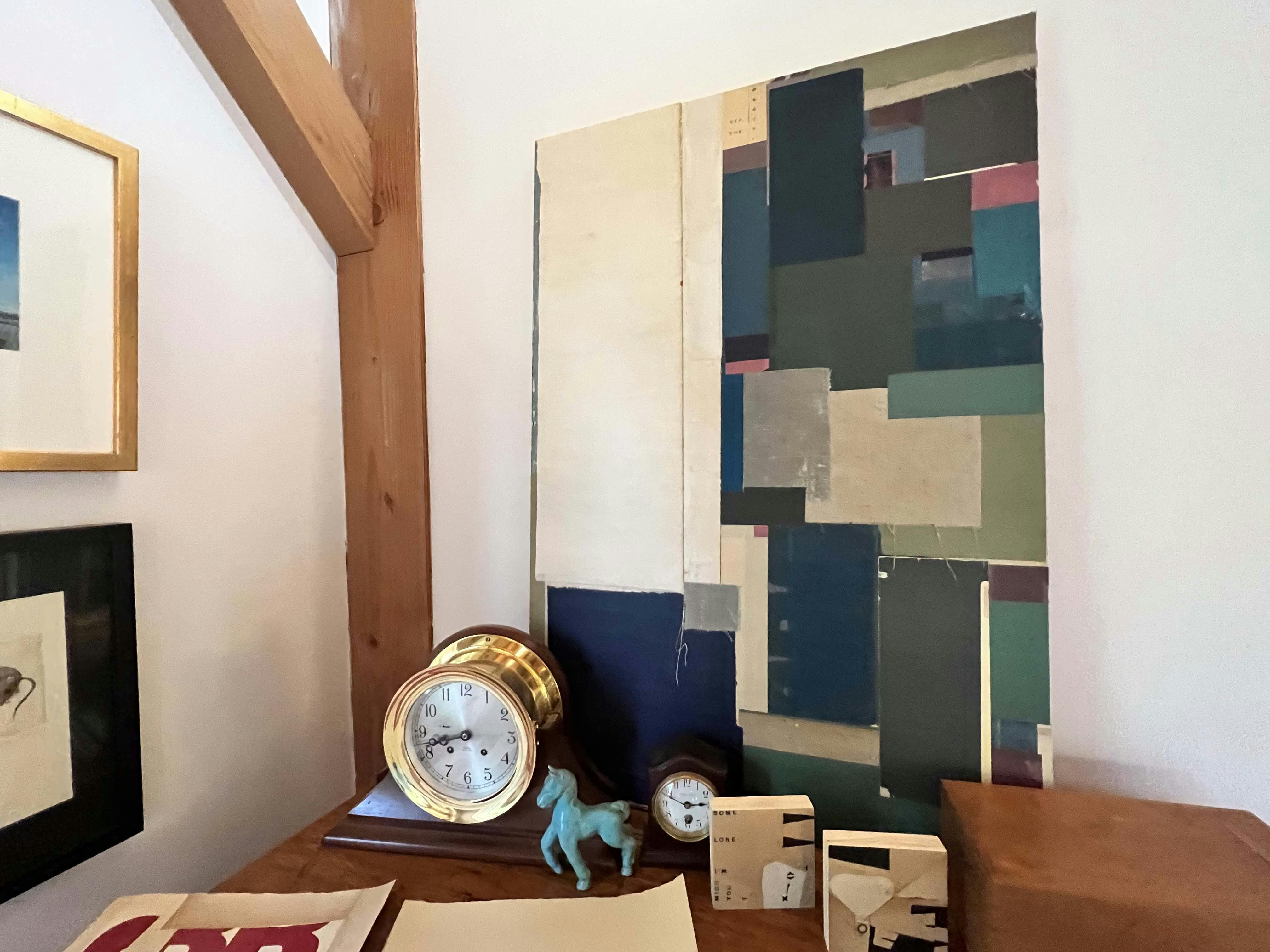 The artist’s longtime passion for books and language comes across in her work, which often utilizes hand-printed letterpress forms alongside repurposed texts. She has a collection of chunky antique letterpress blocks which bring a recognizable quality to her artworks. Printing from these blocks, she incorporates the shapes of the alphabet into intricate collages that also play with color and abstraction. Additionally, her studio is full of antique reclaimed papers ready to be recycled. All of these are neatly organized and sorted by topic. Everything from historic maps to vintage letters are of use as collage material for Short, who acquires pieces at antique shops or online.