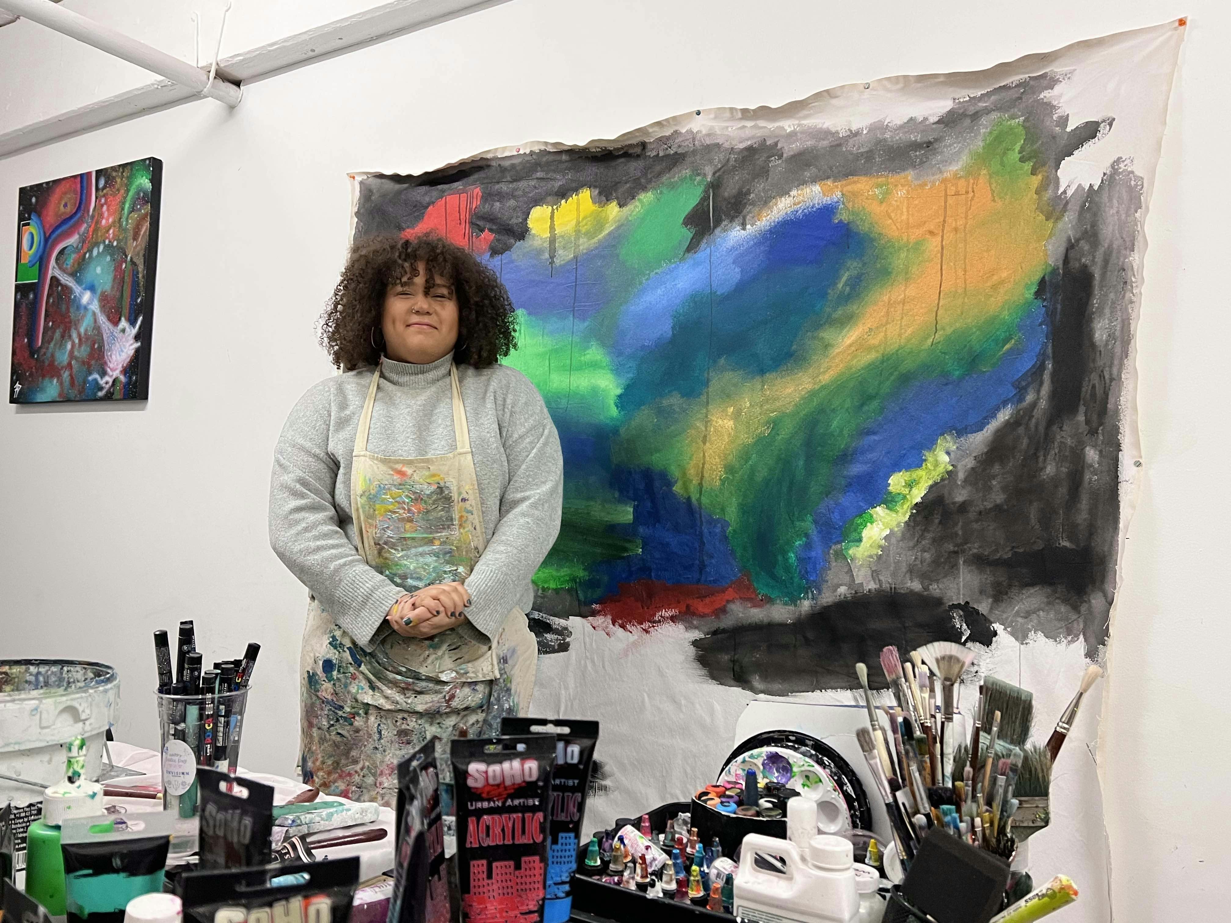 In a short space of time, De La Cruz has established herself as a collegial and community-focused artist who seeks to make connections between peers and introduce more people to the joy of making art. Raised in Cranston, De La Cruz had an interest in visual art from an early age and in high school participated in a Congressional Art Competition. She went on to study Fashion Merchandising at Johnson and Wales, where she graduated in 2019. Early in her career, the pandemic hit and she was forced to shift her focus from an industry job. She chose to pursue her passion for painting and has exhibited her work in exhibitions and festivals throughout the area.
