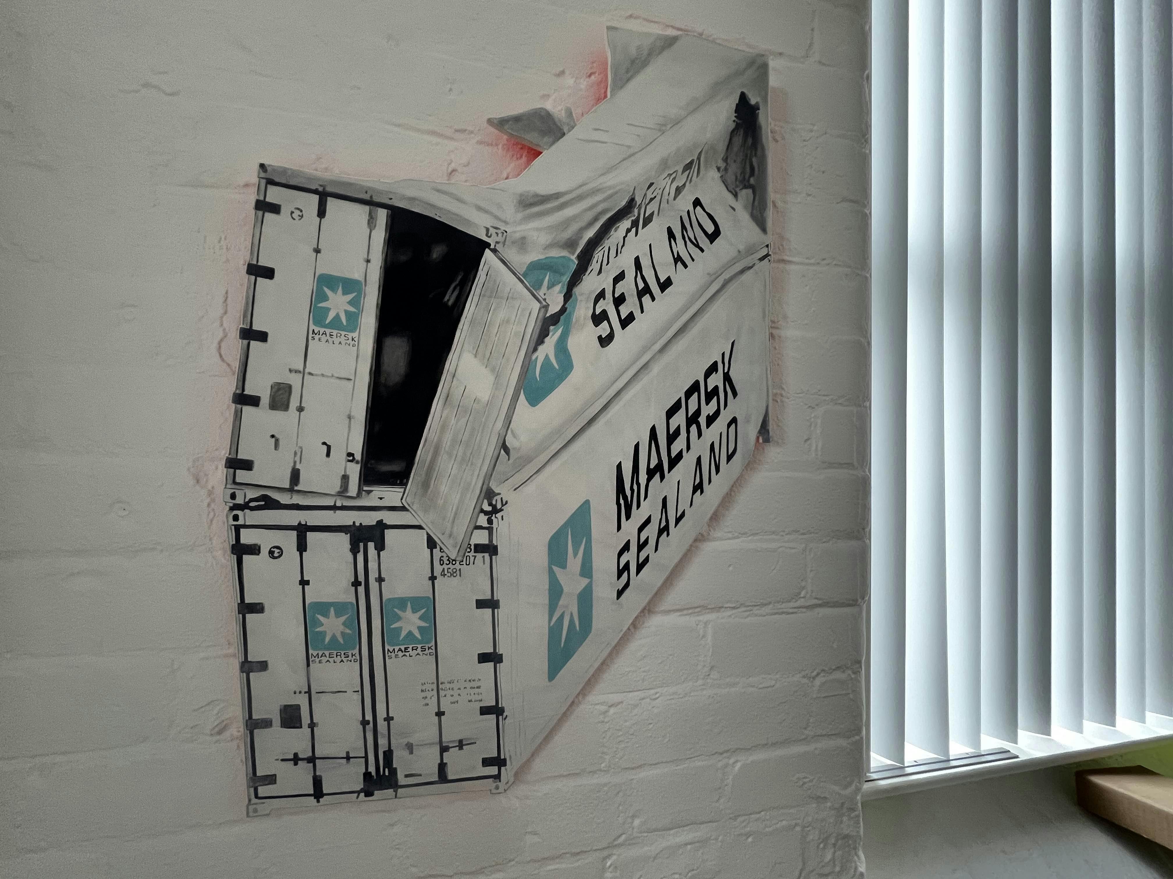 Considering the way living in Rhode Island has inspired her work, Duke says, “The varying uses of Narragansett Bay as a resource influences my work heavily, whether that be in shipping, defense, commercial fishing, or leisure.” The artist shares an anecdote about driving to Quonset during her time as a student at URI to take pictures and do firsthand research into the way the port functioned. She has completed additional pieces that explore the maritime shipping industry. Fastidious paintings of crumpled shipping containers atop enormous cargo ships tell the story of the dangers of the open sea.